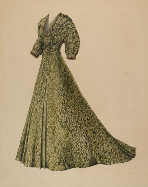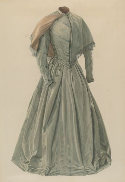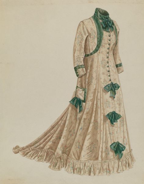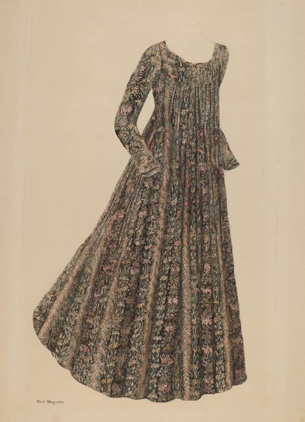 Curator: This delicate watercolor and ink drawing on paper, entitled "Doll," dates back to around 1939 and is attributed to Francis Law Durand. What's your immediate reaction to this image? Editor: There's something incredibly haunting about it. The doll’s expression is blank, almost accusatory. It’s like a captured spirit, peering out from beneath that bonnet. I find myself strangely moved. Curator: It’s fascinating how a seemingly simple piece can evoke such emotion. From a material perspective, I’m struck by the texture the artist manages to achieve with what are, on the surface, very simple techniques. Consider the fabric of the dress - the detail suggests textile production and design of the time. Editor: Yes, the pattern on the dress is exquisite, almost hypnotic. The doll stands in the liminal space between design and art and between life and inanimate things. It’s a fashion sketch come to life… or, rather, undead. Curator: The very limitations of the media—watercolor and ink—perhaps heightened Durand’s artistic choices. It begs the question of intention – was this designed as purely a fashion study? It seems almost to have something personal lurking underneath its surface. Editor: Maybe it was Durand's longing to escape. This doll with her carefully rendered floral print almost reads like a metaphor of enforced gender expectations during this period. It’s a reflection on both artistry and social dynamics. Curator: I hadn't considered that layer to it. Durand’s skill certainly forces one to look beyond mere aesthetics. Thank you. Editor: And thank you for allowing me to connect with this ghostly form in its pretty dress! It’ll be one that will linger with me long after I leave.