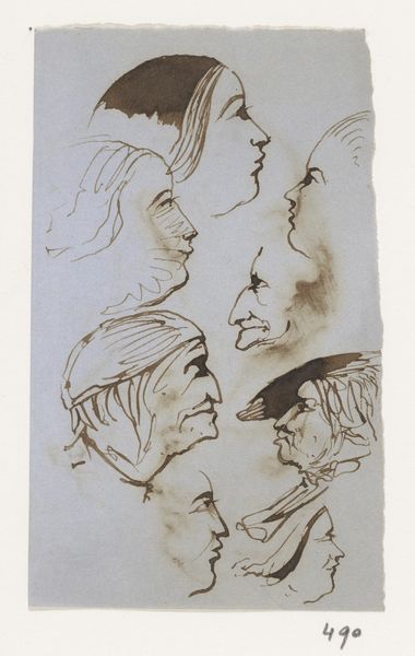 Johannes Tavenraat created "Haas en koppen" with pen in ink on paper. What immediately strikes us is the stark contrast between the delicate, almost frantic lines of the sketches, and the rough, torn edge of the paper. The use of line is particularly expressive here. Each stroke varies in thickness and intensity, creating depth and texture while also suggesting movement. In structuralist terms, these lines function as signs. A single, bold stroke might define a contour, while a series of lighter, rapid strokes could imply shadow or detail. The sketches are seemingly unfinished, almost as if glimpsed in a fleeting moment. This approach challenges the traditional academic ideal of a polished, complete work, suggesting a more modern sensibility focused on process and the immediacy of perception. It invites us to reconsider the artistic value in what is sketched and provisional, and the destabilization of formal qualities and artistic conventions.
