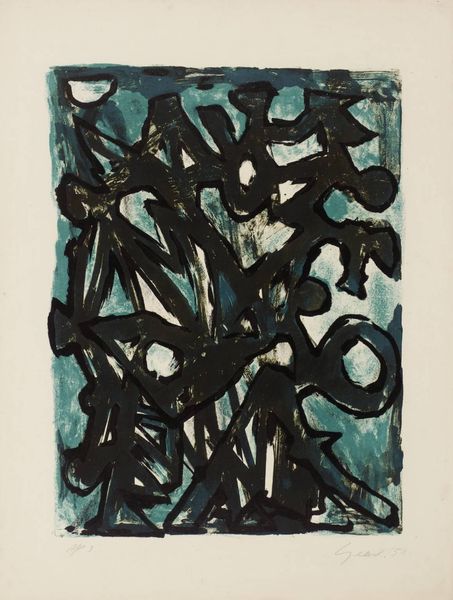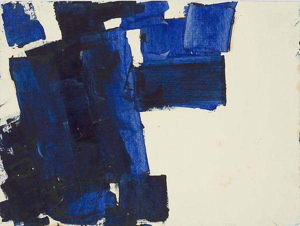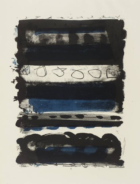 Editor: Right, so next up we have "Wilde VI," created by Melissa Meyer in 1998, using acrylic paint. I’m immediately struck by the strong contrast, these stark black shapes against this very whimsical blue… it’s kind of playful, but also feels very grounded. What jumps out at you when you look at this piece? Curator: You know, I'm glad you picked up on that tension. It’s not quite a head-on collision, more like a…flirty argument between chaos and order, don’t you think? The blacks are bold, sure, anchoring themselves, but they don't quite dominate. There’s a dance happening with that periwinkle blue. What do you make of those sweeping lines? They remind me of calligraphy, almost. Like Meyer is writing with color. Editor: That's interesting! Calligraphy… I hadn't thought about that. I was so focused on the abstract shapes, I didn’t really see that potential movement and rhythm you mentioned. It almost looks like she's doodling in a really sophisticated way. Curator: Exactly! It's controlled spontaneity. Meyer gives us this almost pop-art boldness while also hinting at something deeply personal, almost confessional. A visual journal entry perhaps, but instead of words, she lets color and shape spill out. It feels intensely *her*, don't you think? Makes you wonder what she was thinking, what she was feeling that day in '98. I wonder...do those blue shapes remind you of anything in particular? Editor: I see them as dancing or weaving! But after what you just said, I wonder what was happening in the world around 1998 that she was reacting to. Curator: Oh! And *that* is how art can take us further in the meaning-making process. Editor: So much more to discover now! Thank you! Curator: The pleasure was all mine, keep those beautiful thoughts brewing!