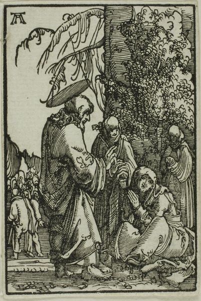 Curator: Before us hangs Durer’s early engraving, dating to 1503 or 1504, titled "Saint Anthony Visits Saint Paul in the Wilderness," held here at the Rijksmuseum. Editor: It’s so dense. The layering of those fine lines creates an almost overwhelming texture. Curator: Indeed. Consider the lines: how they build form, describe texture, even simulate light through density and direction. The composition draws the eye into a meticulously crafted narrative scene. Editor: Speaking of meticulously crafted, one has to consider the sheer labor involved in producing such a detailed image via engraving. The creation of the work, the hand of the artist, impresses itself upon the print. What sort of tools would be needed for this fine detail? Curator: That precise execution, achieved through burins and careful planning, allows for incredibly subtle tonal variations, and therefore, form. Think of the drapery of the saints' robes—the fall and fold articulated with such clarity. Also the background texture of trees and shrubbery. It reflects the ideals of Northern Renaissance art—precision in replicating nature. Editor: Right, and reflecting on those robes, made no doubt from woven wool in those times, that’s where I see the process of this image. The lines create form, yes, but in mimicking cloth or trees they highlight how process shapes our perception of the natural world, turning the wilderness into this almost habitable place for the figures. Curator: There is an ethereal quality, and the symbolic weight of the image as well: a raven bringing bread, a symbol of divine provision. The detail is impressive but its effect comes from the structural perfection, balancing line with form, texture with shape. Editor: Looking closely, you get a real feel for the skill and also dedication to this kind of artisanal practice. Curator: The act of sustained observation and painstaking replication truly elevate the subject here. It allows Durer to capture and then re-present to us a sense of wonder. Editor: A lot to ponder in this little artwork here.