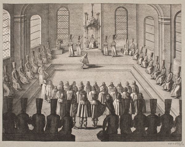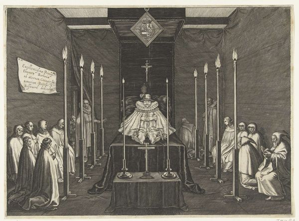 Albert Haelwegh made this print of Henrik Lindenow’s lying-in-state sometime in the mid-17th century. The image commemorates a member of the Danish nobility, and the scene is replete with symbols of wealth and status. Lindenow’s coffin is draped in black and surrounded by candles and mourners. Heraldic shields, possibly representing family ties and achievements, adorn the scene, reinforcing Lindenow's lineage and social standing. Prints like this one served as powerful tools for shaping public memory, reminding viewers of the established social hierarchy. They would have been commissioned by those with the resources to influence perceptions of power and legitimacy. To fully appreciate this print, one might delve into the history of Danish nobility. Archival records from the time, such as family trees, estate inventories, and official decrees, could shed light on Lindenow's place in society and the values that this image was intended to convey. Understanding the institutional history behind these prints, their patrons, and their intended audience, deepens our appreciation for the social and political role of art.
