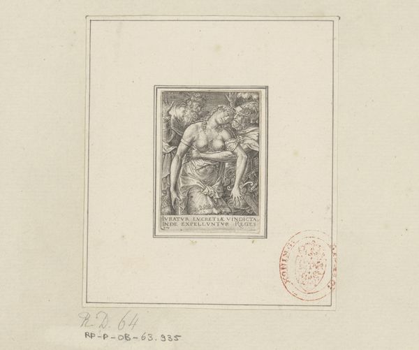 Dirck de Bray created this tiny historiated initial 'J' using pen in the late 17th century, presenting the biblical scene of Joseph fleeing Potiphar's wife. Despite its scale, the composition is dynamic. Note the stark contrast between the static figure of Potiphar's wife and Joseph's hasty retreat. The artist uses the letter 'J' not merely as a frame but as a structural element that integrates with the narrative. The curve of the 'J' subtly echoes the draped fabric and the reclining pose of the woman, while the verticality opposes Joseph's active movement. The density of line work creates areas of deep shadow, heightening the drama and spatial depth within this miniature format. This interplay between form and content invites us to consider how even the smallest details can convey complex themes of morality and human behavior. The use of this tiny initial transforms the architecture of a letter into a stage for human drama.