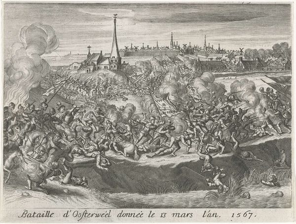 Curator: Immediately, I see chaos. The density of figures, the swirling smoke—it’s all so unnerving. Editor: Indeed. This etching, titled "Battle," was created by Jacques Callot. Though undated, Callot lived from 1592 to 1635, placing it within a period of significant European conflict. Curator: The visual language definitely evokes the Thirty Years' War. It’s more than just documenting; it feels like a commentary on the brutality. Editor: The scale is striking. It's a relatively small work, yet he manages to convey the vastness of the conflict through meticulous detail. Curator: I see how violence is ritualized, even glorified. The smoke almost forms a halo around the fighting, a kind of macabre apotheosis. Editor: It's a powerful reminder of how art can both reflect and shape our understanding of war, its causes, and its consequences. The Harvard Art Museums is fortunate to have this piece. Curator: It leaves me contemplating the enduring human fascination—and revulsion—with conflict. Editor: A small image that contains multitudes, wouldn't you agree?