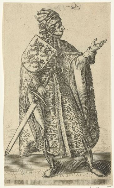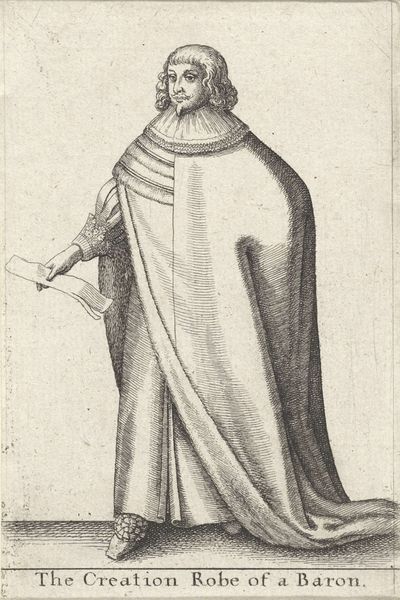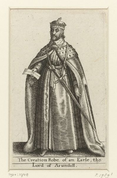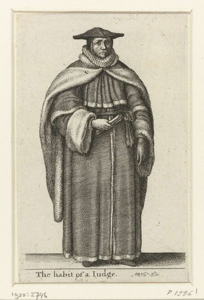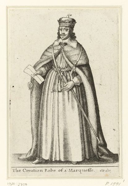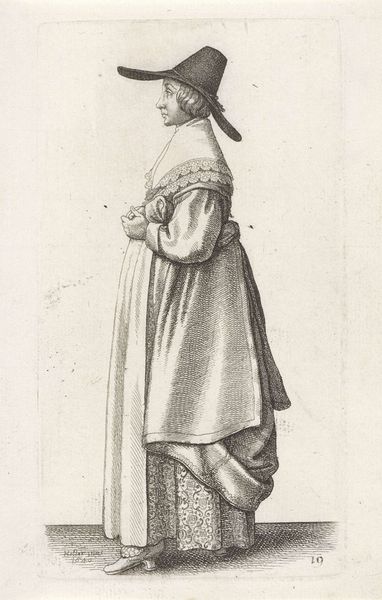 Editor: This print, "English Woman of Quality with a Mask on her Face," was created by Wenceslaus Hollar sometime between 1638 and 1640. I find the woman's posture a bit stiff, but I am drawn in by the strangeness of the mask. What strikes you most about this work? Curator: Ah, yes, isn't she a fascinating apparition? Her pose might seem formal, but it's that very restraint that piques my curiosity. Imagine stepping back in time, being privy to the whispers and rumors that undoubtedly swirled around women of this standing, who cloaked themselves this way. The mask! Is it an invitation or a rebuff? The lace and fur only heighten the drama. It whispers of hidden worlds and masquerades. Do you see the stark contrast between the dark mask and her elaborately textured, shimmering dress? Editor: Yes, there's something theatrical about her. Do you think the mask served a practical purpose? Curator: Perhaps. Or perhaps it's more a symbol of societal expectations, of hiding one’s true self. Or perhaps a daring rebellion, flouting the rigid boundaries of the time, playing with identity, with allure and avoidance, all rolled into one. Consider her context—17th century England, where social standing was paramount, and appearances were everything. Her very existence was performance, wouldn't you say? Editor: That's a fascinating perspective! I never thought of it that way before. Seeing the print now, the woman seems to embody both concealment and confidence, maybe even a hint of mischief! Curator: Exactly! Art allows us to weave narratives and reflect on what we know now. Doesn't it just spark the imagination? A real, breathing woman… captured in a singular moment, forever veiled in mystery. Editor: I think it does. Thanks for that interpretation, it's given me a lot to consider.