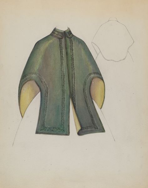 This drawing of a suit was made by an anonymous artist with graphite and watercolor. It feels like a record of a process. The way the drawing is made, with a focus on the details of the suit’s design, suggests a deep interest in the act of creation. The paper is light and the graphite lines are delicate, yet the watercolor gives it a robust material presence. The application of color isn't about blending, it’s more like each mark is left to do its thing. Notice the detailing of the flowers: they are all different and have their own perspective. If you look closely you can see the tiny details and the way the artist worked with a fine brush, adding layers to create a sense of depth. It's not about hiding the process, but about reveling in it. The precision in the rendering reminds me of the fashion illustrations of Erte, but with a more casual, hands-on feel. I'm left thinking about how art is just a conversation that unfolds across time, a way for artists to connect and build on each other's ideas.