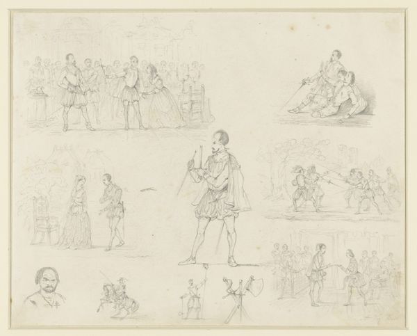 Editor: So, here we have "Studies van soldaten," or "Studies of Soldiers" by Pieter Bartholomeusz. Barbiers, dating from 1782 to 1837. It's a pencil drawing, and what strikes me is how raw and immediate it feels. Almost like a glimpse into a private sketchbook. What do you make of it? Curator: I see a fascinating document of artistic labor and the production of imagery related to military life. It begs us to consider the context: what kind of training or apprenticeship involved copying these poses? What function did these sketches serve, both for the artist and perhaps later, in the distribution or reproduction of military archetypes? Note the repetition of certain poses – seated on a barrel, wielding a weapon. It's almost like a proto-industrial approach to image making. Editor: Interesting! So you’re saying the seemingly simple act of sketching is actually connected to broader social and economic structures? The making of soldiers and the making of art related? Curator: Precisely. Think of the materials themselves – pencil and paper were becoming increasingly accessible. How did that influence who could create and consume images? This sheet may well be from a larger sketch book: imagine these as a practice not in 'high art' but for mass consumption perhaps. Where did Barbiers obtain the materials? The cost of paper at the time is important to consider. This simple sheet drawing is connected to burgeoning trade routes and mercantile consumption Editor: I never thought about a drawing this way, focusing on access to paper. That really reframes how I see this seemingly simple work. Curator: Exactly. By questioning the material conditions, we challenge assumptions about artistic genius and individual creation. How much freedom did the artist actually have when picturing solders in a militarized and regulated environment? Editor: Right! So much to think about beyond the individual figures and romantic narrative. Curator: It challenges a narrow focus of traditional analysis focused merely on style! It is really the materiality that drives its cultural value for historians like me. Editor: This makes me realize how much history is embedded within these artistic processes. Thank you!