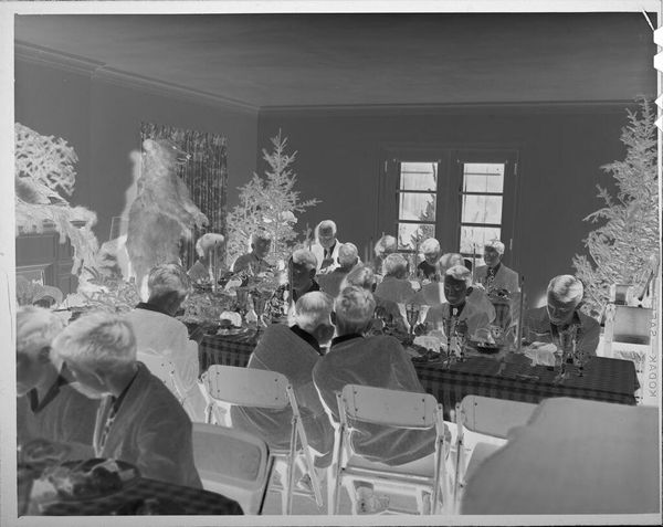Curator: First impression? It feels like a memory half-forgotten, filtered through a lens of time and maybe a touch of childhood wonder. Editor: Indeed. What strikes me immediately about "Untitled (man in top hat performing for children's party)" by Lucian and Mary Brown is the stark, almost ghostly materiality of the medium itself. It looks like a photographic negative. Curator: Right? Like a dream that's been turned inside out. I wonder what it felt like to be one of those kids, witnessing magic, literally in reverse. Editor: And consider the labor involved. This is pre-digital photography—each image a result of precise chemical processes, careful darkroom work. The "magic" of photography is just as constructed as the magician's illusions. Curator: It makes you think about the hidden work behind every performance, both on and off stage. Editor: Precisely. This image, in its material form, embodies both the ephemeral nature of performance and the concrete reality of its production. Curator: It seems like it pulls back the curtain in both ways, doesn't it? Editor: Yes, reminding us that both magic and art are cleverly wrought illusions, crafted from very real materials and labor. Curator: What lingers for me is the way it invites us to believe again. Editor: And to examine the means by which that belief is manufactured.