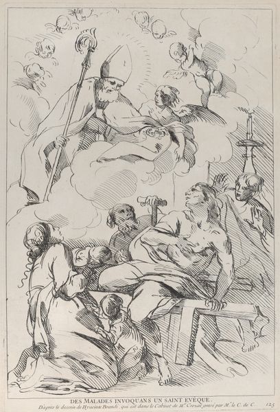 Editor: This drawing, held at the Städel Museum, is titled "Kranke rufen einen heiligen Bischof an", which translates to "Sick People Calling Upon a Holy Bishop," by Giacinto Brandi. It's ink on paper, and the whirlwind of lines really creates a sense of drama. What strikes you when you look at this piece? Curator: Indeed, the Baroque aesthetic privileges dynamism and emotional intensity, which Brandi achieves primarily through line. Note how the frantic, swirling lines delineate form and evoke movement, yet simultaneously threaten to dissolve those very forms into a unified, chaotic surface. Consider, for example, the contrast between the relatively stable diagonal of the bishop's crozier and the frenzied, almost scribbled rendering of the clouds. Editor: So, it's less about depicting a realistic scene and more about capturing a feeling, or an experience, through the energy of the lines? Curator: Precisely. The figuration itself is almost secondary to the sheer energetic force communicated through the drawing’s compositional structure. Ask yourself how the arrangement of the figures—the way they cluster and reach—contributes to this sense of dramatic appeal. And how does Brandi leverage line variation and density to distinguish planes and guide the eye? Editor: It does feel like all the figures are reaching towards the bishop, their lines more frenetic the closer they are to him, and calmer around the edges. It is almost like the image itself is calling us, the viewers. Curator: Precisely. The drawing’s strength lies in the formal relationship between these visual components. The overall effect emphasizes not just a depiction, but the visceral impact of belief and the plea for divine intervention through artistic structure alone. Editor: I didn’t even realize how the artist uses such simple strokes to portray profound suffering. It is the structural composition that intensifies that emotional reaction to the work. Curator: Precisely, Editor. We learned how Brandi wields lines to sculpt not just images but palpable sensations, turning the act of viewing into a deeply affecting encounter.