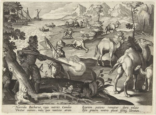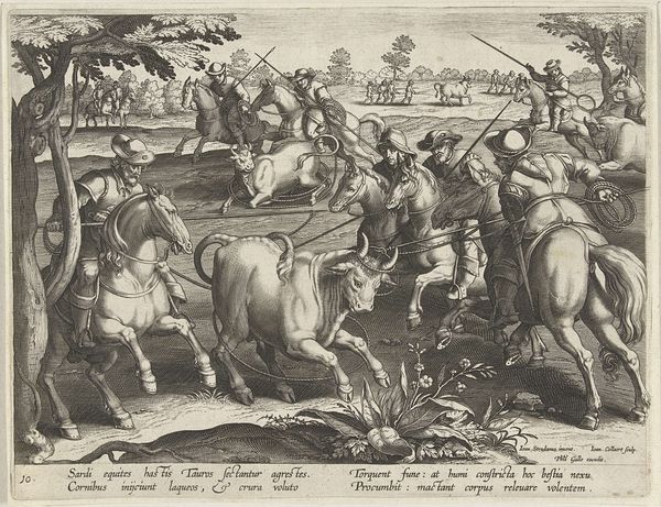 Editor: This is “Cloelia steekt te paard de Tiber over,” a 1573 engraving by Pieter Jalhea Furnius at the Rijksmuseum. It’s so detailed! What strikes me most is how theatrical the scene is, everyone seems to be posing. What's your take on it? Curator: It’s interesting that you say "theatrical". Consider the public function of prints like these in the 16th century. They circulated widely, weren’t they? They weren't just art objects; they were disseminators of stories, of Roman history, in this case the tale of Cloelia escaping Porsena and swimming across the Tiber. Editor: That makes sense. It was a form of propaganda, almost? Curator: In a way, yes. These images reinforce classical values that the elites are keen to promote. Cloelia is portrayed as virtuous and brave, which would've resonated with viewers familiar with classical texts. Notice the depiction of the Tiber god in the lower right, and how the image presents Rome on either bank. What does that say about the message? Editor: So the composition itself, like, amplifies the symbolic weight of the narrative and reminds viewers of the glories of Rome itself, and what values it needs to uphold? Curator: Precisely. Prints helped solidify these cultural and political ideals by visually celebrating figures and events, influencing public sentiment. Think about where such prints might be displayed. Editor: It shifts my understanding entirely to see it less as art and more as a calculated social object with real influence on political opinion. Thanks! Curator: My pleasure. Looking closely reminds us that art rarely exists in a vacuum. It interacts with culture.