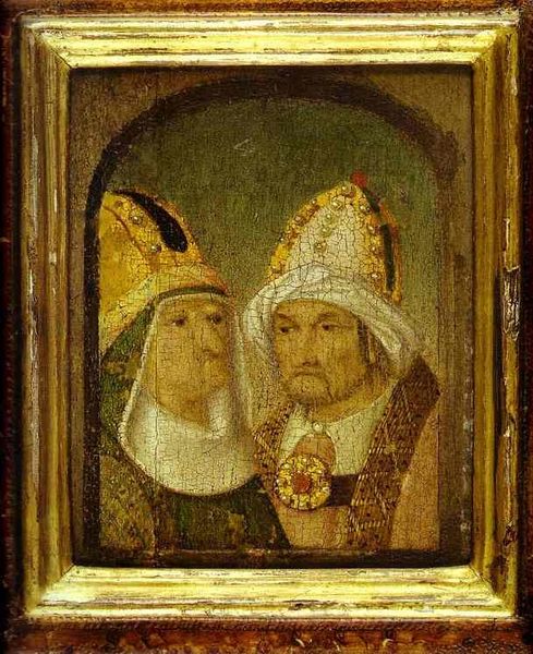 Curator: Look at this double portrait attributed to Gentile Bellini, dating back to around 1480. It’s identified as depicting Sultan Mehmed II, also known as Fatih Sultan Mehmet. Editor: It strikes me as remarkably…divided. Two figures in conversation, yet almost completely isolated from each other, separated by the dark backdrop. There’s a palpable tension. Curator: Exactly. Consider Bellini’s own positionality as a Venetian artist working at the Sultan’s court. The painting serves as a record of cultural exchange and the commissioning process inherent in the production. How do we interpret artistic patronage and power dynamics when art travels across cultures? Editor: While acknowledging those dynamics, can we not also appreciate the formal contrast? Note the left figure, clean lines, a youthful smoothness to the face…almost ethereal. The right, however, weighted down by heavier linework, the clear aging around the eyes, a certain groundedness. Curator: Groundedness that arises from the materials available to Bellini, and the skill of his workshop. The pigments used, their sources, and their cost—they reflect global trade routes and the very real material circumstances of artistic production under Imperial mandate. It invites questions about how such a likeness might serve diplomatic relations. Editor: Diplomatic perhaps, but aesthetically, this duality amplifies its power. See how their turbans echo each other, similar yet subtly different in ornamentation? It binds them, speaks to shared status while simultaneously allowing Bellini to delineate stark differences in character and possibly…authority. The interplay of color alone, restrained versus richer, evokes entirely different emotional landscapes. Curator: Precisely! This contrast likely signifies shifts in the very structure of labor. Were multiple hands involved? Does it signify changes in Ottoman trade policies influencing availability of materials during the project? The question is what it tells us about how identities were being fashioned – quite literally – through these commissioned objects. Editor: So, you view it primarily through the lens of its making? For me, while recognizing those elements, I can’t dismiss its compelling composition— the push and pull of those gazes and how skillfully Bellini contrasted forms, all serving the narrative weight embedded within its structure. Curator: And I find that the power is rooted precisely there – how it was fabricated, the materials available, and the social context influencing every brushstroke, inviting discourse beyond the visual realm. Editor: Well, it's an invitation I won’t refuse but also view as testament of form in conveying even wider complexities than purely historical means might achieve.