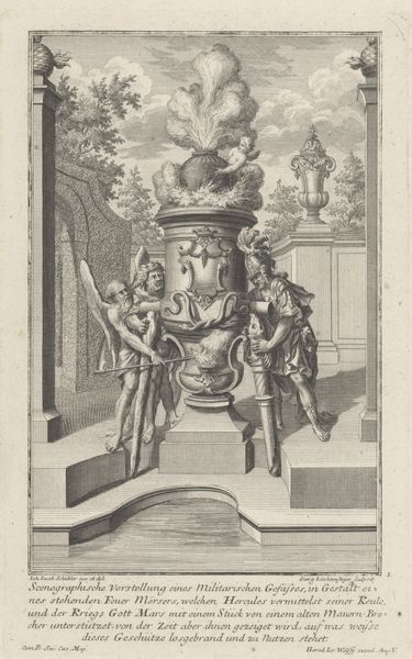 Editor: This is "Gezicht in een laan met een tuinvaas," or "View in an Avenue with a Garden Vase," an etching and engraving by Sieuwert van der Meulen from 1707. The crisp lines and architectural precision create a really formal atmosphere. What stories do you see in this piece? Curator: I see a manifestation of power and control. These meticulously planned landscapes were tools used by the elite to reinforce their dominance. Notice how the architecture and the landscape are completely intertwined, reflecting a desire to tame nature itself. Who benefitted from this taming, and who was excluded from this vision of order? Editor: So, the garden isn't just a pretty backdrop, but a symbol? Curator: Precisely. It speaks volumes about the societal hierarchies of the time. Think about the labor required to create and maintain this idealized view. The artist gives us no glimpse into the lives of the workers, who made such extravagant displays of wealth possible. Editor: It’s unsettling to consider what is left out. But without knowing the social context, one could easily overlook it. Curator: That's why it's so important to examine art with a critical eye, thinking about whose stories are being told, and whose are being erased. The beauty can distract us from deeper inequities, which is the perfect, subtle propaganda. Editor: I will certainly look closer in the future. It’s helpful to consider that art may actively work toward some ideology. Thank you! Curator: My pleasure. Art offers us not only a view of the past, but also a lens for understanding our present and agitating for change.