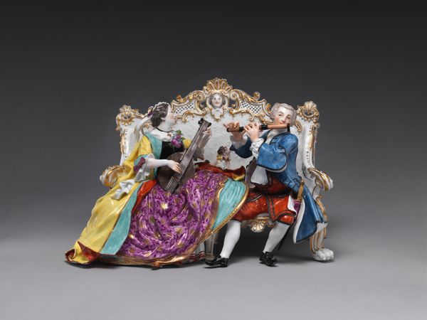 "The Deceived Weakling", made by the Meissen Manufactory, is a porcelain figurine that captures a moment of high drama and social critique. The composition is striking, with figures arranged in a dynamic pyramid, drawing the eye upward through their intertwined forms. The delicate, almost translucent porcelain enhances the sense of fragility, mirroring the vulnerability of the central character. Notice the vibrant use of color, carefully applied to accentuate the theatricality of the scene. The floral patterns, the Harlequin's costume, and the pink lining of the man's robe create a visual feast. The smooth texture of the porcelain contrasts with the implied textures of fabric and skin, adding depth to the narrative. This piece engages with ideas of deception and power dynamics within social relationships. The exaggerated gestures and expressions are signifiers of a society obsessed with appearances. The figurine destabilizes conventional notions of virtue and strength, revealing underlying tensions through its meticulous and ornamental form. This is not merely decoration, it's a commentary rendered in clay, a testament to the era's complex social landscape.
