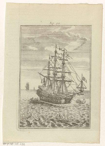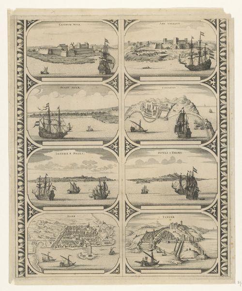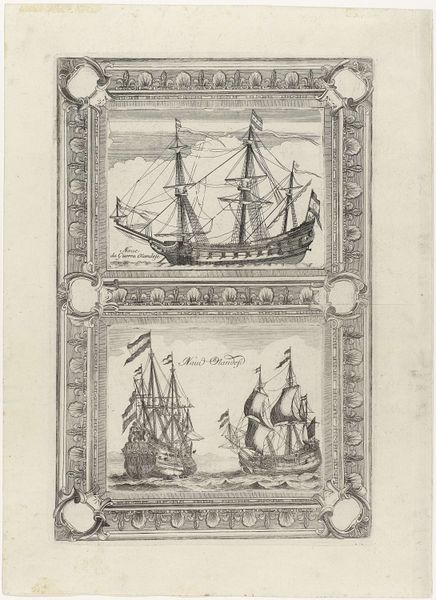 Editor: This print, titled "Two Warships", dates roughly from 1660 to 1718 and is attributed to Vicenzo Maria Coronelli. The detail is amazing. I find it interesting that the ships are placed within these very ornate, decorative frames. What strikes you about this work? Curator: What immediately grabs my attention is how these aren't just representations of ships, but active participants in the politics of imagery during the Dutch Golden Age. Think about the context. The Dutch Republic was a major naval power and a mercantile empire. Editor: So, these images served a purpose beyond simple documentation? Curator: Precisely. Prints like these circulated widely. They visually communicated Dutch power, technical prowess in shipbuilding, and their control over maritime trade routes. They also contributed to a sense of national identity. The ships themselves become symbols of the state. Do you notice how different the style is between each ship in terms of purpose, naval or trade? Editor: I do now that you point it out. The top one seems larger and more decorative. So its a flex of naval power in image form! Were these prints commissioned by the government? Curator: Potentially. Patrons of the arts commissioned prints to signal their status. What you're seeing is a visual strategy reinforcing power through cultural representation. Editor: This reframes my entire perception of the artwork; it goes beyond just being a historical depiction of ships and becomes an artifact deeply entrenched in socio-political narratives of its time. I learned how political context dictates artistic representation. Curator: And seeing how art actively participates in shaping a society's image, its power structures. Thanks!