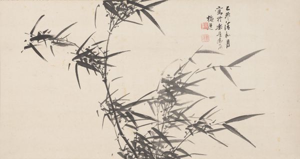 Curator: We’re looking at “Squirrel,” a piece executed with ink and watercolor on paper, likely by the hand of Ding Yanyong. Editor: It’s immediately striking—so much life conveyed with such minimal means. That squirrel looks like it’s about to leap right off the paper! Curator: Indeed. The imagery evokes themes of agility and resourcefulness—qualities often associated with squirrels. They've symbolized preparedness and industriousness across various cultures. But beyond the animal itself, note how the foliage adds to this effect. Editor: Those broad, almost geometric leaves are really fascinating. They seem almost to contain the raw essence of the organic matter, if that makes any sense? I am struck by the handmade quality of the painting and how it conveys its relationship to nature. What do you make of it being on paper? Curator: The choice of paper supports a direct connection to cultural traditions of painting. The symbolism deepens with the use of traditional materials – each loaded with cultural significance and collective memory, as it gives a certain grounded nature to an otherwise active image. Editor: And there is something about its immediacy as well. Look closely, you can almost feel the give of the brush against the paper. The strokes appear quite rapidly and deliberately, demonstrating the artist’s technique but also calling to mind other ink paintings. The swift strokes of ink seem to capture not just the animal's form, but also its essence. Curator: Precisely! Consider the blank space surrounding the subjects; it’s not emptiness but potential, suggestive of the animal's environment extending beyond our immediate view and inviting the viewer into the action. It emphasizes how integral symbolism and image is with a certain culture. Editor: This artwork really pushes me to consider our interaction with and understanding of nature, mediated through skill, production, and even material limitations. So, the choice of medium isn’t just aesthetic, it is almost…conceptual? Curator: That’s insightful! We have to consider this choice not only shapes our perception, but gives form to shared historical knowledge. Editor: Absolutely, seeing "Squirrel" through a material lens offers fresh perspectives. Curator: And appreciating those material connections truly enriches our understanding.