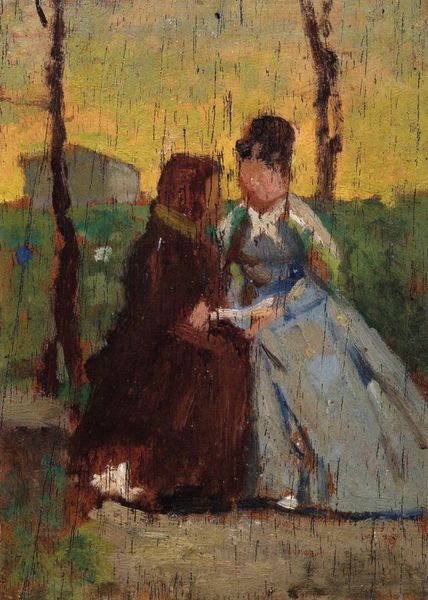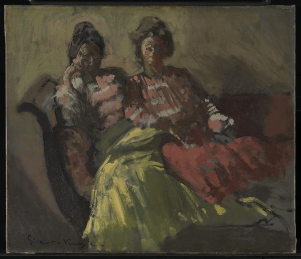 Editor: This is "A Marengo" by Walter Sickert, currently in the Tate collection. I'm struck by the ambiguity of the scene; the women seem to be in a private moment, but what that moment is, I can't quite grasp. What's your take on this, considering its place in art history? Curator: Sickert often depicted scenes of everyday life, particularly focusing on the lives of working-class people. This painting, with its muted tones and seemingly unposed figures, reflects a broader trend of realism in art, aiming to portray life as it is experienced, away from idealized or romanticized visions. How does that reading impact your interpretation? Editor: I hadn't thought of it that way. Knowing Sickert was capturing a slice of everyday life shifts the focus. It makes me wonder about the social context—what roles did women occupy during his time, and how does Sickert portray them? Curator: Exactly! And those are the questions to continue to ask about the politics of imagery. These nuances give us context for how we view the work today. Editor: That’s a great perspective. Thank you!