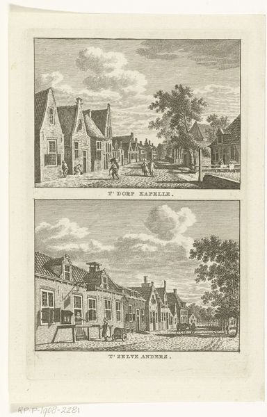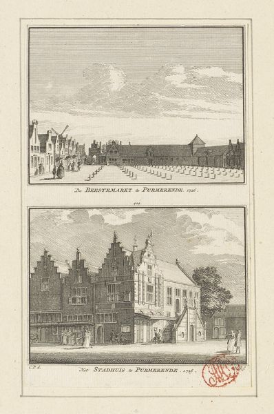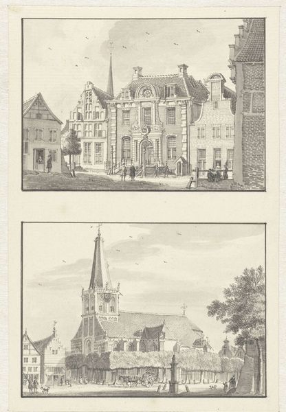 Editor: We’re looking at "Twee stadsgezichten te Utrecht: Mariaplaats en Lutherse kerk," or "Two City Views of Utrecht: Mariaplaats and Lutheran Church," by Carel Frederik Bendorp, made sometime between 1786 and 1792. It's a print made using etching. It feels very… orderly, doesn’t it? A little stiff. What catches your eye about it? Curator: Stiff perhaps, but charming too, like a meticulously arranged dollhouse. For me, it's the light. See how it gently caresses the buildings, especially in the Mariaplaats view? It's almost theatrical, highlighting the everyday rhythms of the city. And those tiny figures! Each one feels like a miniature actor on a carefully constructed stage. Does the presence of those diminutive figures make you wonder about their stories? Editor: I hadn't thought about it that way, but you’re right. They do feel staged. It's interesting you mention the light; now I notice how different the lighting is in the two views. The Lutheran Church scene is much flatter. Curator: Exactly! The upper view practically vibrates with life, while the lower feels more… reserved, perhaps? Could this be intentional, reflecting different aspects of city life, the bustling square versus the quieter church district? Editor: Maybe! Or maybe the artist was just better at capturing light in the first one! It definitely draws my attention more. Curator: Haha! A fair point. Maybe it tells us something of Bendorp's personal fondness. Do you think these neat orderly images could have been made from observation only, or something else informed these depictions of Utrecht? Editor: Hmmm… Perhaps these were made from preliminary sketches or preparatory drawings… Curator: Ah, a very strong and intuitive guess. A print is typically the end product. What did you think of it? Editor: I see it in a completely new light now, thank you!