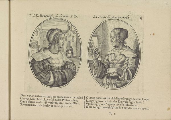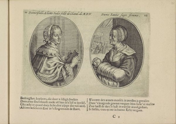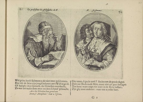 Editor: This print, "Lapsnijder en zijn vrouw" from 1641 by Crispijn van de Passe the Second, shows a tailor and his wife in separate oval frames. It feels almost like a cautionary tale – the man looks burdened, the wife seems severe. What can you tell me about the societal context surrounding this piece? Curator: It's insightful to pick up on that tension. Remember that the Dutch Golden Age wasn't golden for everyone, and societal expectations weighed heavily. These paired portraits, often commissioned by the burgeoning middle class, visually codified prescribed gender roles. Notice how the setting for the man includes a skyline, referencing his public sphere, while the wife is enclosed inside, signifying the domestic realm. The text below reinforces these positions with social commentary in that era. Do you think the clothing or facial expressions suggest social commentary? Editor: Yes, absolutely! The man's slumped posture contrasts with his wife’s erect stance. His plain clothing emphasizes his weariness, while her fur-lined jacket projects a sharper image. But what about the specific choice of a tailor and his wife as subjects? Was there a particular reason, or was it just depicting everyday life? Curator: Occupational portraits were common, especially among the middle class seeking to affirm their status and moral standing. The tailor, as someone who literally pieces things together, could represent diligence and order, values highly esteemed at the time. The poem beneath the portraits offers a rather didactic message about the ruin brought about by a troublesome wife, so there may be further cultural attitudes being displayed here. How does the depiction relate to other representations of tailors and their wives during the Dutch Golden Age? Editor: That's a great point, it's really interesting to view this through the lens of social commentary. It seems to have opened my eyes to aspects of the work that I hadn't initially considered. Thank you. Curator: And thank you! It’s crucial to analyze how images reinforce or challenge societal norms of their time and consider the historical effects such artworks can have.