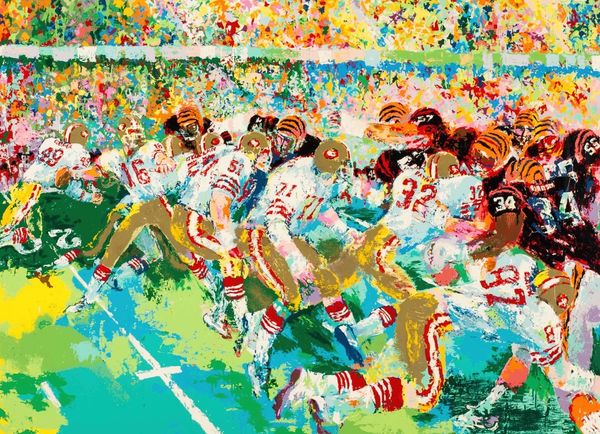 LeRoy Neiman captured this image of Super Bowl VI with paint, using an action-packed, colorful style. Flags wave from the top tier of the stadium, a motif used since ancient times to signify territory or triumph. Here, these flags are not merely national or heraldic symbols; rather, they mark the boundary of collective emotion, the fervor of the crowd spilling onto the field. These symbols resonate with ancient Roman banners, echoing the pride and the ecstasy of victory, even frenzy, from the ancient circus. Consider the raised arms, not just of players but of spectators, a gesture dating back to antiquity, signifying reverence, victory, and surrender alike. This primal expression transcends the football field, linking to ancient rites and communal dances where bodies in unison express deep-seated emotions. It taps into our collective memory. The game becomes a stage for ancient dramas, where heroes clash and symbols intertwine, each brushstroke echoing primal human drives and age-old symbols of triumph and unity.