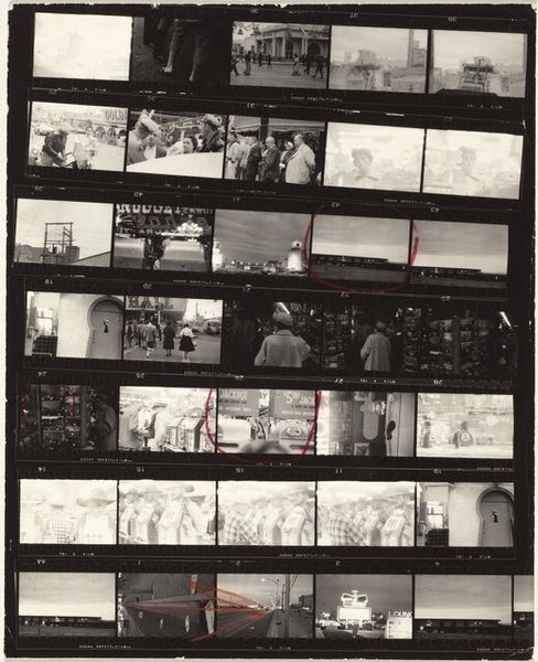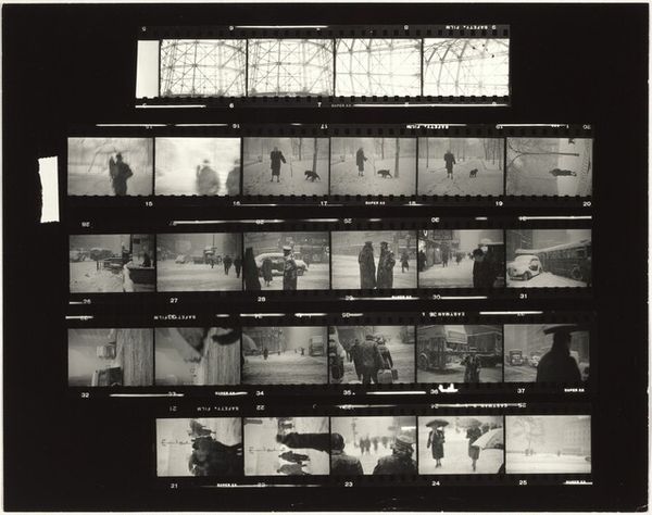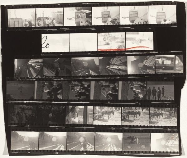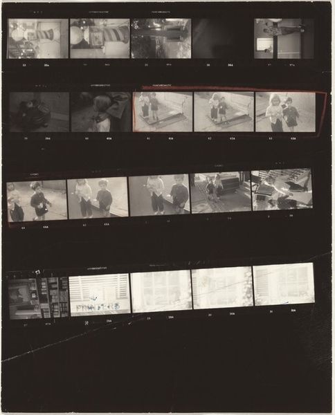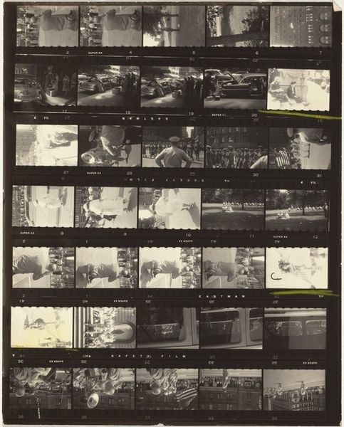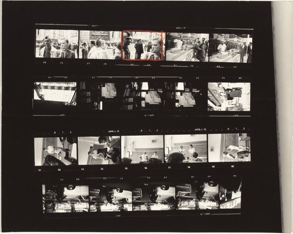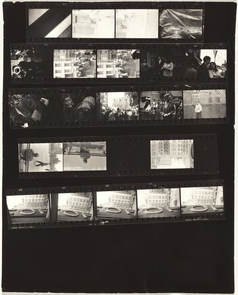 Curator: Editor: Okay, so we're looking at Robert Frank's "Various family S28" from 1951, a gelatin silver print showing rows of different photographs, contact sheet style. It feels very fragmented, like snippets of different stories. What do you see in this piece, and how can we interpret its structure? Curator: Well, what strikes me immediately is the layering – not just of images physically arranged on the sheet, but conceptually. Frank isn't just presenting single photographs; he's presenting the *process* of seeing, selecting, and archiving. The contact sheet format exposes the photographer's choices, the frames that didn't make the final cut. Do you notice how this defamiliarizes the traditional notion of a pristine, perfect photograph? It reveals the messy reality behind constructed images, no? Editor: That's true. I hadn't thought about it as revealing a process, but now I see it. It also makes me think about accessibility...like breaking down the "untouchable" aura of art. Curator: Exactly! And if we consider the context of 1951, in the midst of the Cold War anxieties and burgeoning consumerism, this kind of fragmentation could be seen as a visual reflection of societal anxieties. What constitutes "family" in a society built on prescribed roles and images? He includes some darker and stranger photos in contrast to photos of family. What does that evoke? Editor: Hmmm...So, you're suggesting that the breakdown of visual narrative reflects the potential cracks within societal structures and ideals. Very insightful! Maybe that relates to how different groups and types of families were represented in popular media at the time. Curator: Precisely. Think about whose stories were *not* being told. Whose images were being marginalized? Frank seems to push against the dominant narrative, almost hinting at what lies beyond the constructed ideal of family and social conformity. The photographs start conversations around intersectionality. Editor: Wow, I really appreciate you framing it that way. It takes the artwork into a bigger discussion of society at the time. Curator: Absolutely, looking at a photograph not only as an aesthetic object, but also an entry point to wider societal issues, especially relating to marginalized stories, adds to our understanding and appreciation. I appreciate the possibilities it holds, too. Editor: Yeah, that was a helpful conversation. Now, I'll definitely think about the process behind the photos themselves.
