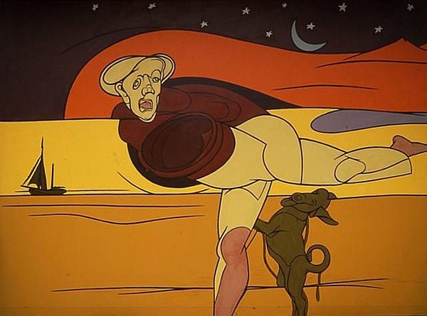 Valerio Adami created this self-portrait, presenting us with a puzzle of identity and representation. The artwork prompts us to consider how artists construct their self-image, and how this reflects the broader cultural and social context of its time. Made in Italy, Adami's self-portrait employs a style that echoes elements of Pop Art and a graphic sensibility reminiscent of comics. The disjointed composition, with the artist holding a mask-like face, challenges traditional portraiture. The figure's awkward pose and the fragmented setting suggest a sense of alienation or perhaps a critique of the artist's role in society. Adami was working in a time of social and political upheaval. To understand this work fully, we might delve into Adami's biography, examining his influences and the artistic circles he moved in. Researching the cultural discourse around identity and representation in post-war Europe would enrich our understanding. Art history isn't just about the artist, but about the world that shapes them.