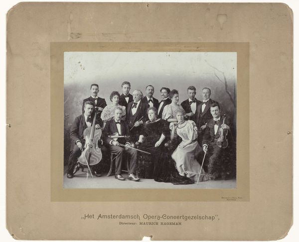 Curator: Here we have an intriguing group portrait dating from between 1880 and 1920, attributed to H. Sanders & Co. The composition and tonal range provide quite a lot of points of access into its function as a document of a specific historical period. Editor: It has a somber, almost formal tone, doesn’t it? The neutral hues add to a sense of seriousness that surrounds these people and the building behind them. The poses feel carefully constructed to maintain the image. Curator: Indeed. You immediately note the deliberate arrangement, a testament to the conventions of group portraits during this era. The brickwork in the backdrop is almost graphic— providing a stark framework. How do you think this impacts the reading of the individuals in it? Editor: It grounds them, literally. The brick signifies establishment, permanence. The image operates within systems of meaning already built within Dutch society, I feel, conveying solidity and collective identity and…respectability? They're projecting a shared social front to any and all viewers in the future. Curator: And note the interplay of light and shadow— how it molds the figures and accentuates details. Take their clothing: it establishes hierarchies but also levels them out through the sombre chromatic choice, which also seems reflected in the very material culture they represent. Editor: Absolutely, that use of light, it gives depth but also an almost… theatrical quality. It highlights faces, draws out contours, but also emphasizes a certain conformity within the frame. No one is trying to distract. The work gives some indications of the social climate; and that is, orderliness and the image as a tool to create some record of their place within the country. Curator: A fine point to wrap it up there. Looking at this photograph, we can better understand and contextualize not just the figures in front of the camera, but how their communities aimed to represent themselves as a reflection of that. Editor: Right, a moment suspended, meant to mean something, which continues on to this moment and potentially countless others to come. Fascinating to have a view into this scene from over a hundred years past.