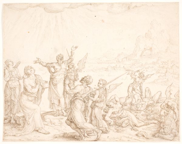 Editor: So, this is Domenico Piola's "Sketches of Religious Scenes," done in pen and ink on paper, sometime in the late Baroque period. It's…fragmentary, almost like a storyboard. What should we be paying attention to here? Curator: What strikes me immediately is the representation of power dynamics inherent in these scenes. Piola, working in a deeply religious context, grapples with how authority, both divine and earthly, is visually constructed. Think about the poses, the gestures, and the settings – who is dominating whom, and how does that relate to societal structures of the time? Editor: I see what you mean. The baptism scene at the top right is pretty overt. What about the scene with the sheep? I suppose the shepherd would represent authority? Curator: Indeed, but let’s not overlook the complex social fabric interwoven within even seemingly simple pastoral scenes. Who owned the sheep? Who benefitted from their wool? Consider how wealth and resources are distributed, and how Piola's choices – his specific compositional elements – may reflect the values of his patrons and the world they inhabited. Do you see any visual clues about status in these figures? Editor: I see the draped clothing that some figures wear, and others don't. Would this suggest different social roles or levels of religious status, such as being closer or further from God? Curator: Precisely. Piola subtly layers meaning, encouraging viewers to decode these social hieroglyphs. Also consider, how does depicting these biblical scenes reinforce the existing power structures within the Church itself? What role did art play in shaping religious identity and consolidating control? Editor: It's a little unsettling to think about these artworks not just as expressions of faith but also as tools for maintaining power. But it gives me a lot to think about! Curator: It reframes how we understand history, doesn’t it? The artist's hand, intentionally or not, participated in the power dynamics of the day, which were built and maintained with social, cultural, and religious norms. We’re not just looking at pretty pictures but complex social documents.