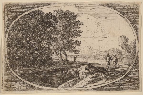 Herman van Swanevelt created this print, "Path to Left of a Large Tree and a Stump," capturing a serene landscape. The dominant tree acts as a symbol that has been used throughout history. The tree, a symbol of life and interconnectedness, connects the earth below with the heavens above. We can trace it back to ancient mythologies such as the Norse Yggdrasil or the Tree of Knowledge in biblical narratives. The presence of the tree evokes a deep, subconscious response—a reminder of our connection to nature. It calls forth ancestral memories and a sense of belonging, seen in how similar motifs appear in later works as a comforting constant. Note how this symbol is repeated and transformed across various cultures, each adding its own layers of meaning, and engaging with viewers on a deeply psychological level.