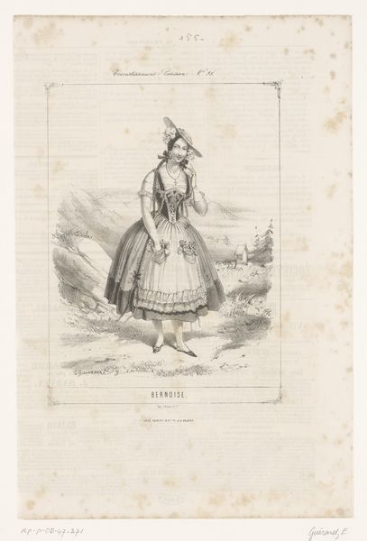 Curator: Before us, we have a drawing titled "Incroyables et Merveilleuses, 1814, Merveilleuse, No. 22 (bis): Chapeau de paill (...)," dating from 1814 by Georges Jacques Gatine, created using pen on paper. Editor: It’s startling how demure yet otherworldly the figure appears; that giant feather atop her head is arresting and somewhat dampens the neoclacissism; a somewhat ghostly figure with exaggerated sleeves floating over the faint wash landscape. Curator: Indeed. These images played a pivotal role as markers of shifting gender roles in French society. "Merveilleuses" was the name given to women who represented extravagance, and this piece captures that spirit of radical fashion amidst political transition. This "straw hat," the two tiered dress –it spoke volumes. Editor: Tell me more about those radical fashions? Were they meant to democratize access to style, material-wise? Those gathered sleeves, while appearing opulent, read rather simple in production. A light linen, perhaps easily replicated at home? Curator: Exactly. In post-revolutionary France, fashion served as a crucial form of expression. Neoclassical aesthetics allowed a kind of fantasical reinterpretation of antiquity, expressing modernity and, crucially, individual identity, the woman as citizen, using codes everyone understood in its own way. Editor: And what about the materials? Paper and pen, an accessible method for dissemination of fashion trends. Curator: Precisely. This drawing represents the industrial and social shifts of the time: here, simple inexpensive materials reproduce fashionable tropes and signal their wider circulation; this image speaks of a proto-capitalist world where "personal" fashion trends trickle from the center to the masses through accessible media and readily reproducible dress codes. Editor: Seeing this as a fashion plate alters the read completely— Suddenly it is less about this individual woman and more about accessibility to style. Curator: Absolutely, that is where the symbolic power resides! This Gatine’s Merveilleuse now opens a world of material history, feminine subjectivity, and radical shifts in social symbolism! Editor: Definitely. Seeing this piece with an eye to production methods really makes one rethink ideas around access, style, and expression through dress.