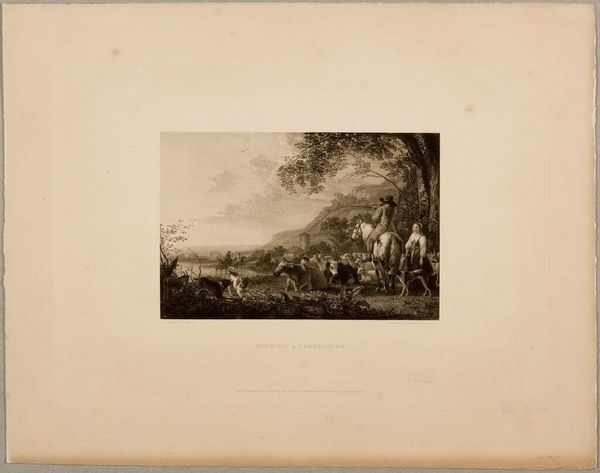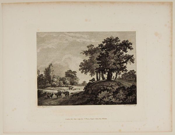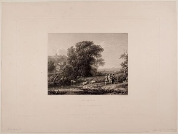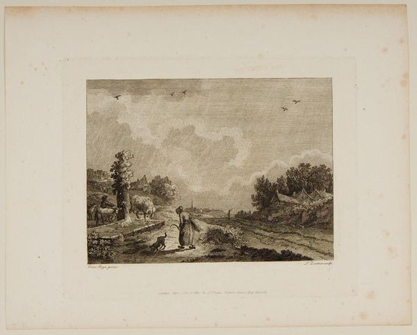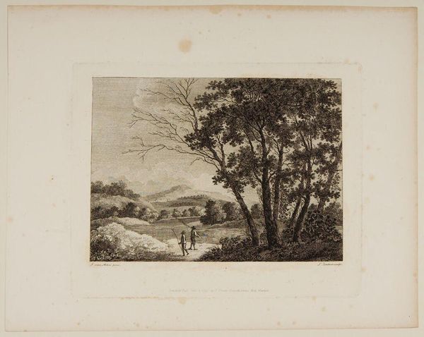 Curator: This is "Plate II" by Adrian Zingg, created sometime between the late 18th and early 19th centuries. Editor: It's a landscape that feels both vast and intimate at once. So airy and quiet. Curator: Zingg was a master of topographical art, and this work exemplifies his ability to capture a sense of place, likely for the rising middle class interested in landscape imagery. Notice the workers busy harvesting in the fields. Editor: They almost blend into the landscape, tiny and purposeful. It makes me think about the rhythm of the seasons, the constant cycle of work and rest, life and death. Curator: Absolutely, and it's a reflection of the socio-economic structures of the period, too, a world that’s both romanticized and grounded in labor. The rising middle class consumes the image while the working class labors in the field. Editor: A poignant reminder of the distance between seeing and doing, then and now.