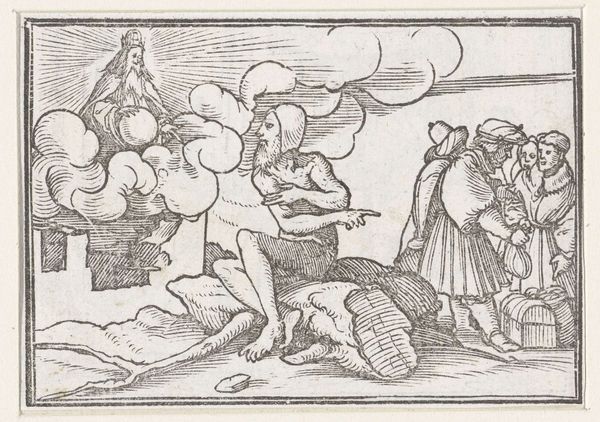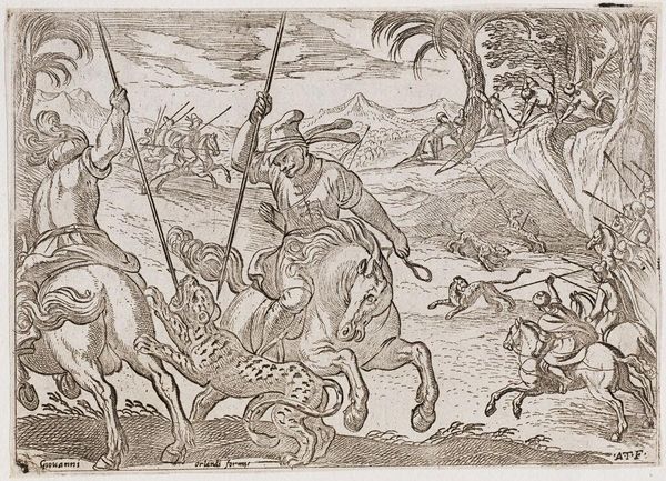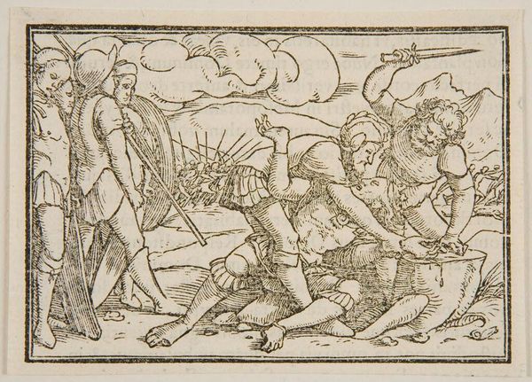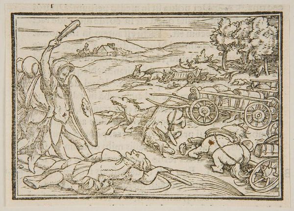 Curator: Woah, okay. Immediately, I get a very harsh and almost aggressively graphic feel from this, despite the meticulous details. The rigid lines make everything seem stark. Editor: Indeed. What we are looking at is a woodcut made in 1538 by Hans Holbein the Younger, depicting "Joshua as military leader of Israelites with bodies of the defeated kings." Curator: "Defeated" is one way to put it, looks more like a battlefield massacre, doesn't it? All those fallen figures... Is that Joshua towering in the center? He's kind of a cool customer amidst all the carnage, wouldn’t you say? Editor: He is indeed. The print shows a biblical scene of conquest and divine justice, part of a series Holbein created reflecting the Old Testament. The work emphasizes themes of leadership and the consequences of defying divine will. Holbein aimed to make complex historical narratives visually accessible to a wide audience through print. Curator: Divine will always makes for great art, or at least interesting questions. The pen work almost has this insistent quality... And, is it just me, or do the supporting characters appear strangely calm, watching this whole drama play out from their remove? Like a bizarre theatre audience on the sidelines... Editor: I agree. The medium of print certainly made art more accessible, which facilitated wider dissemination of ideological narratives—just as photography or film do in modern political culture. It’s crucial to remember that works like these served ideological functions tied to religious and political powers. Curator: Ideological function. Always a complicated concept, that. I suppose every image wants to sell something, but is that necessarily an issue? What grabs me is just the emotional intensity that gets conveyed via Holbein’s rigorous artistry. Even those distant mountains feel jagged with symbolic resonance. Editor: I believe appreciating art’s social implications provides richer contexts, particularly understanding historical and cultural contingencies surrounding an artist's role within larger society. In that vein, I’d argue Holbein’s skills amplified powerful messages during Reformation times. Curator: A compelling thought to go away with. This little image shows me how graphic styles carry emotional tones, while at the same time, I wonder who paid for Holbein to create such images. Editor: Exactly! That relationship with the market always steers content—it's key to ask how art both embodies individual genius while equally representing larger sociopolitical structures. Thank you for these insightful perspectives.