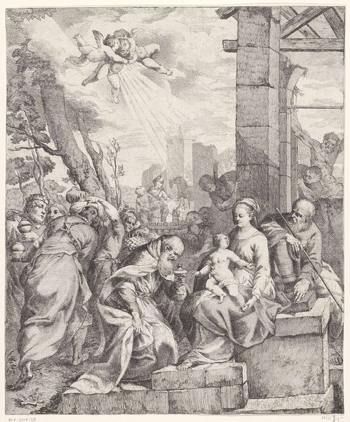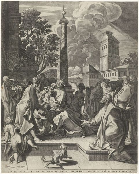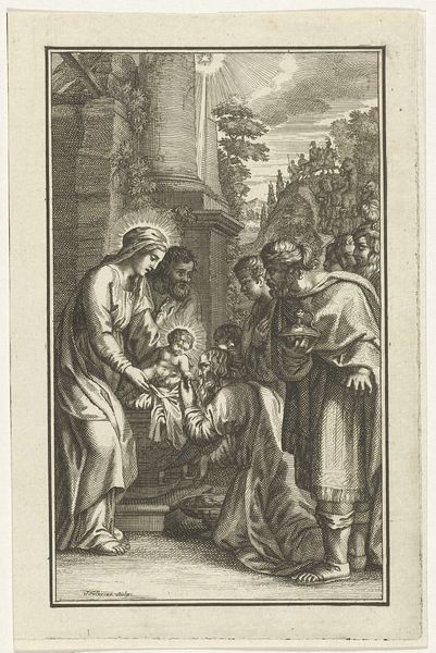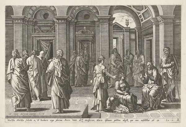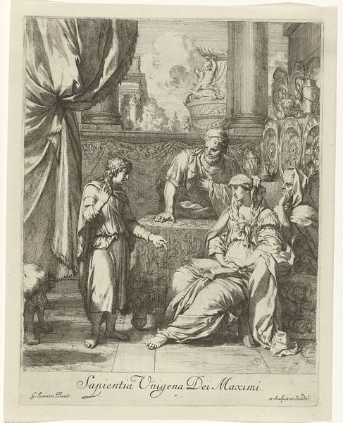 Curator: The piece before us, held in the Rijksmuseum, is an engraving from 1737 by Pieter Tanjé titled "Lucius Papirius vergeeft Fabius Maximus." Editor: My initial impression is one of classical solemnity, mediated by the starkness of the engraved lines. The monochrome palette emphasizes form and gesture, though I find myself drawn more to the dynamic grouping on the left, near the bottom of the print, rather than the seated figure. Curator: Precisely! Tanjé masterfully employs line to capture the narrative, depicting the moment when Lucius Papirius, despite his authority and youth, forgives the elder Fabius Maximus. We see it staged as a grand historical painting, an instance reflecting themes of power, forgiveness, and civic duty, and it speaks volumes about the values upheld during its time. Editor: Indeed. Look closely at the composition. Tanjé has positioned the figures carefully, leading the eye from the forgiveness scene up to the imposing architecture in the background. It’s an essay in contrasts—the stoicism of the seated figures balanced against the implied bustle of the figures along the ground, each meticulously rendered to give us clues as to their social class and station within Roman society. The artist clearly wants us to think about the interplay between individual agency and the larger structures of authority at play here. Curator: Absolutely, and in the 18th century, such a narrative would be laden with contemporary significance. It encourages a discourse on leadership and moral responsibility, particularly relevant in the context of burgeoning Enlightenment ideals and shifts in societal power structures. Who is really in power in the frame here, Papirius or Fabius? Or the State? Editor: Consider how Tanjé handles the varying textures: the smooth marble of the building facade contrasts with the draping of their robes, achieved solely through skillful hatching. This careful attention to detail contributes to a sense of depth and realism. Also, have you considered the function of space in the work, Curator? Note the careful division of pictorial space—a literal architecture of composition. Curator: Yes, it brings to life the intersection of personal and public morality. It reminds us that historical artworks are often mirrors reflecting the social anxieties and moral debates of their own eras, inviting us to engage in critical dialogues on contemporary values. The placement of power, social responsibility, justice, what else do you find when deconstructing this image? Editor: Overall, beyond the overt narrative, there is a mastery of line and form that allows Tanjé to explore deeper formal relationships. Curator: It is always about what is beneath the image that elevates these stories and allows them to continue to be told and be heard, even hundreds of years later.
