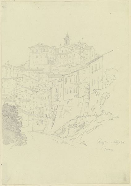 Editor: This is Ernst Fries’ “Rom, Häusergruppe an der Aurelianischen Mauer,” drawn in 1826. It's a pencil drawing, quite delicate in its lines. I’m struck by the way the buildings seem to almost grow out of the landscape, like a natural extension. What catches your eye when you look at it? Curator: It’s that very merging of nature and architecture that captivates me too! Fries seems to suggest that the built environment and natural world are intertwined, coexisting and evolving together, don't you think? It’s Rome, after all—a city built on layers of history, where ruins become foundations. Perhaps he saw a reflection of that resilience in these buildings nestled against the ancient wall? Editor: I hadn't thought about the idea of "resilience," but I see that! The crumbling walls do seem to suggest persistence over time. Curator: Exactly! And the muted palette of the pencil drawing, doesn’t that create a sense of timelessness, as if we are looking at a memory, a dream? It is the essence of Romanticism after all—a nostalgic glance at the past, tinged with longing. Imagine Fries, sketching this scene nearly two centuries ago; he may also be struck by its antiquity. What do you think that he want to capture through it? Editor: Maybe he wanted to document a piece of history that was slowly disappearing, before it was entirely lost? This makes me think differently about sketches as a means of preserving the past. Curator: Beautifully put. Each stroke of his pencil, an attempt to freeze a fleeting moment. The Romantics certainly valued capturing such scenes that might be vanishing! Thank you for giving me new perspectives on seeing and interpreting it! Editor: Thanks, that was truly insightful. I'm starting to appreciate the quiet power in these seemingly simple sketches.