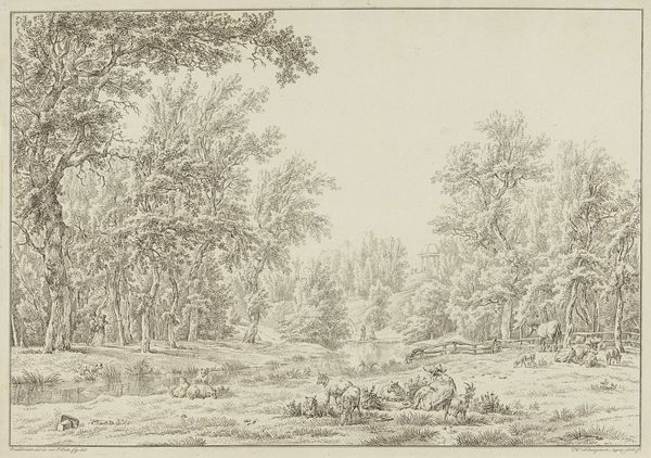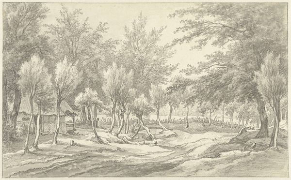 Editor: Here we have "Landschap met bomen, huizen en rechts een hek" or "Landscape with Trees, Houses, and a Fence on the Right," made sometime between 1801 and 1856 by Henricus Turken. It’s a drawing made with pen and ink, and it feels so calm and serene. I'm struck by the attention to detail. What can you tell me about it? Curator: This tranquil scene offers a glimpse into the relationship between artistic representation and evolving social attitudes toward the landscape. Consider the historical context: early 19th century. As urban centers grew, landscapes were increasingly romanticized as emblems of simpler times and national identity. How might this drawing be understood within the institutional framework of art at the time? Editor: You mean, like, how would it have been displayed and viewed? Curator: Exactly. Was this meant for public exhibition or private collection? The linear style, bordering on topographical, makes me wonder if this drawing wasn’t intended as a record, perhaps influencing later paintings or even engravings intended for a wider audience. Note also the deliberate placement of the fence – a symbol of land ownership and division – juxtaposed with the inviting, open path. How does this tension shape our understanding of the work? Editor: That's a really interesting point. I hadn't thought about the fence that way – as a socio-political boundary, not just part of the scenery. Curator: Consider also the role of institutions like the Rijksmuseum, which preserves and interprets these images. Museums influence what art is valued and how the public engages with art. Editor: So, it’s not just about what the artist put into the drawing, but also about the cultural values that we bring to it, even now. That gives me a lot to think about. Curator: Precisely. Looking at this artwork from today allows us to acknowledge these different interpretations. Hopefully, visitors can reflect on the dialogue that arises from our changing viewpoints.