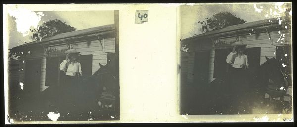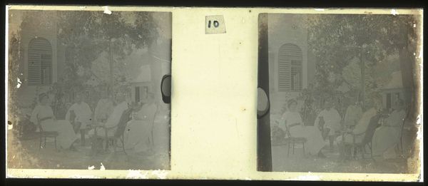 Curator: This is a gelatin-silver print dating from 1913 to 1930. It’s a genre painting photograph by Theodoor Brouwers, titled “Visite op plantage Accaribo,” now at the Rijksmuseum. Editor: The composition strikes me immediately—a posed gathering under what appears to be a porch. The worn edges of the print and monochrome palette lend a subdued, almost melancholic air. Curator: Indeed. Gelatin-silver prints, popular during this period, involved coating paper with light-sensitive gelatin emulsion containing silver halides. The process allowed for sharper details and greater tonal range than earlier photographic methods. It was the dominant photographic printing process for almost a century. Think about the conditions for developing a photograph in the field back then! Editor: I'm captivated by the seated figures, arranged as if on a stage. The wicker chairs offer a tactile element; one almost imagines the sensation of sitting in one on a hot day. But they are symbols as well of tropical colonial life. Curator: The wicker provides crucial support. They also speak to the social context: the availability and mass production of such furniture at that time reflected industrial developments impacting colonial lifestyles. It tells us a story about the material culture and the means of consumption. Editor: Observe the clothing, long dresses and light-colored suits, these reinforce the picture's social meaning and offer glimpses into sartorial norms. And yet there is something strained about the gathering; everyone seems slightly removed. Curator: Look more closely at their surroundings and we begin to understand how constructed the setting actually is. You start to realize that even photographs required set arrangements. Editor: Absolutely. We are both bringing to the image distinct questions regarding its impact. I see potent imagery and you trace the image’s tangible existence. The interplay helps flesh out this glimpse into early twentieth century life on Accaribo Plantation. Curator: It highlights how an object can offer a wide window of information if interrogated from all directions and how we arrive together to create a fuller context.