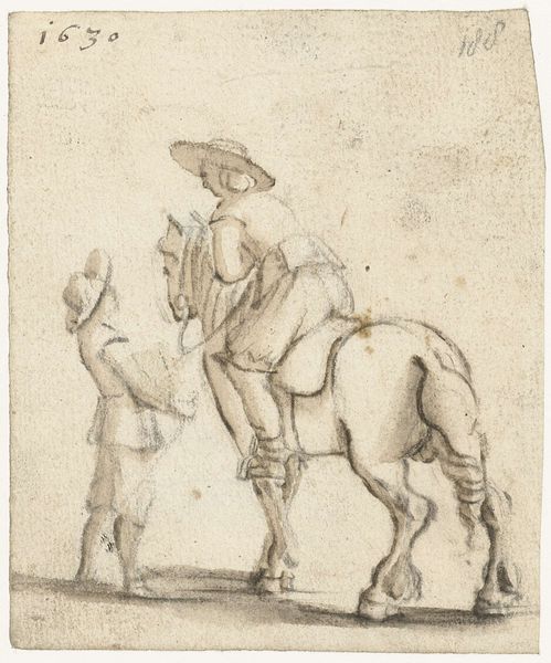 This print, Soldier on Galloping Horse, was created by Stefano della Bella, likely in the mid-17th century, using etching, a printmaking technique that democratized image production. The process involves coating a metal plate with a waxy, acid-resistant substance, through which the artist scratches an image. When the plate is bathed in acid, the exposed lines are eaten away, creating grooves that hold ink. Della Bella, known for his detailed observations, captures the texture of the horse's coat and the soldier's armor with remarkable precision, using varied line weights. Prints like this were part of a burgeoning visual culture, driven by increased trade, where craft skills met commercial demand. The relatively quick, repeatable process allowed for widespread distribution of imagery, making art more accessible. This etching embodies a moment where traditional artistry encountered early industrial methods, influencing both the way art was made and consumed. Ultimately, understanding its making helps us see how this small print reflects larger shifts in society.