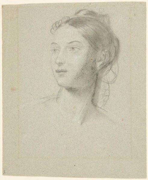 Editor: Here we have Washington Allston's "Head of a Young Woman with Hair Braided on Top of her Head." It's a delicate drawing, almost ghostly. What do you see in this portrait? Curator: Notice the headdress, or rather the suggestion of one. It's a void, a mass of shadow, yet it crowns her. What memories or aspirations might that symbolize for you? Editor: Perhaps a lost culture or an aspiration for higher knowledge? Curator: Precisely! Allston often used symbolic portraiture to explore Romantic ideals and individual psychology. That rough sketch may imply a mental space, yet to be filled. Editor: That's insightful, making the sketch feel more complete. Curator: Indeed, it speaks volumes about the subject, and about Allston's own artistic inquiries.