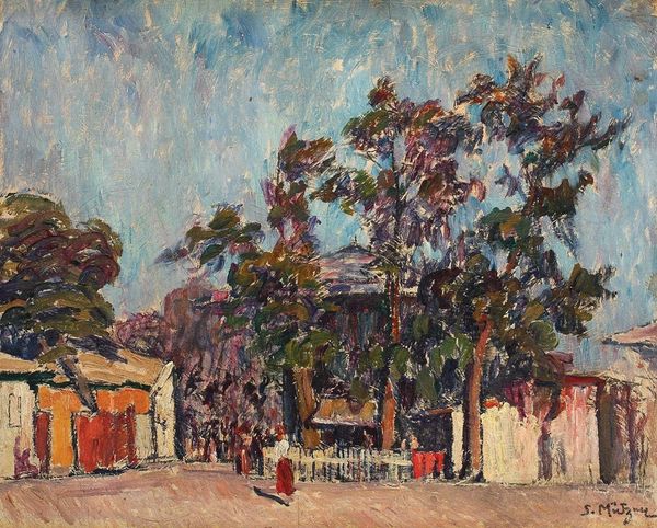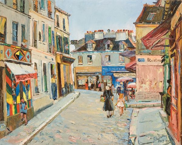 Curator: This is Utrillo’s “La Place du Tertre,” held here at the Tate. It really captures, for me, a kind of quiet stillness. Editor: Yes, there’s something muted about it, almost a monochrome. The heavily worked surface conveys such a powerful sense of place; I can almost feel the dampness of the stone. Curator: Utrillo's famous for these street scenes, and his materials were, shall we say, unconventional. He mixed plaster into his paint to achieve that unique texture. Editor: Which makes perfect sense! The plaster gives the buildings this almost crumbling, textured effect. It's like he’s not just painting the buildings, but also the history and labor embedded within them. Curator: Indeed. There's a melancholy here, a sense of faded grandeur, that speaks volumes. A real sense of authenticity. Editor: Absolutely, and seeing the painting this way really grounds it, doesn’t it? It gives us a new perspective on the materials and their significance.