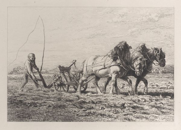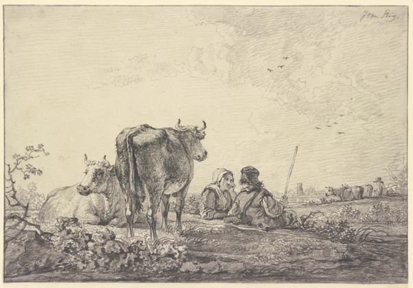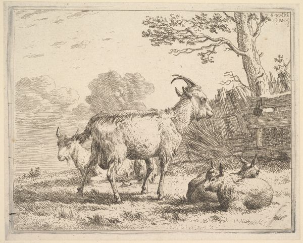 Editor: This etching, "En hjord drives frem," or "A Herd Being Driven Forward," by Gerrit Claesz. Bleker, likely created sometime between 1592 and 1656, is quite captivating! The scale is relatively small, but the scene it depicts feels so expansive. I'm curious, what strikes you most about this piece? Curator: Well, first, the choice of etching is important. Printmaking, particularly during the Dutch Golden Age, meant accessibility. Consider how this image would have been produced: a copper plate, acid, ink, paper, and the labor to create and distribute it. This wasn't some inaccessible oil painting only viewable by the wealthy elite; it circulated, engaging a wider public with pastoral imagery and genre scenes, even across social lines. Editor: So, you're saying the very nature of the print affects our understanding of the artwork itself? Curator: Exactly. It makes us think about production. Bleker isn’t just showing us a romantic landscape; he’s demonstrating the availability of such images, manufactured objects designed for consumption. Notice, for example, how labor is subtly presented in the form of the man goading the herd onwards, while another figure appears relaxed, perched comfortably on horseback, seemingly directing labor. There is perhaps some critique of power embedded here, too. Editor: That's a perspective I hadn't considered. I was caught up in the idyllic nature of the scene, the details of the animals and landscape. Curator: It *is* beautiful, but beauty can be strategically produced, like any other object. And consider, what fueled this burgeoning art market of the Dutch Golden Age? The immense wealth generated by trade and, yes, exploited labor, which then filtered through the consumption habits of all levels of society. Editor: So the subject matter, a simple herding scene, almost hides the complex system of labor and materials that brought the artwork into existence. Thank you for revealing that deeper level. Curator: Precisely. It shows how something that appears simple is, in fact, the result of complex social forces and systems of material production.