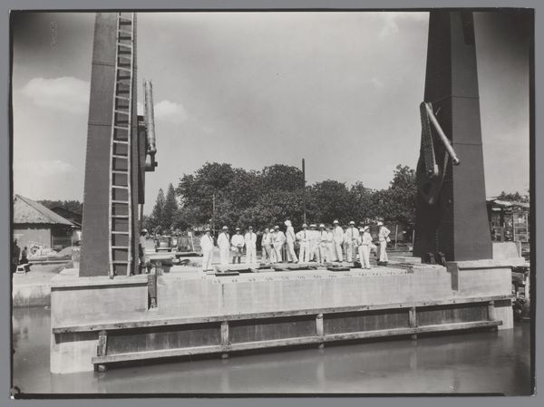 Fotopersbureau Stevens captured this photo of "Verfrissing in het zwembad" (Refreshment in the Pool). It’s a small photo, but it feels expansive, like it could keep going forever. Look at how the figures overlap, creating a sea of bodies soaking up the sun. It's all in black and white, which lends it a timeless quality, despite the specificity of a crowded pool. The way the sunlight falls across the scene, it creates a textured surface of shadows and highlights. The photographer doesn't hide the graininess of the image – instead it adds to the immediacy of the moment. There’s a ladder going into the pool on the left; it's almost abstract in its starkness. It reminds me of a Sol LeWitt sculpture, simple and functional, yet visually striking. This photo is not about perfection; it’s about the raw, unfiltered energy of a summer day. It's like when you see Weegee's crime scene photos. It captures a collective experience. Ambiguity is embraced, and perhaps, that's the point.
