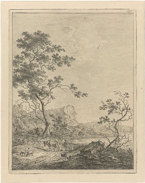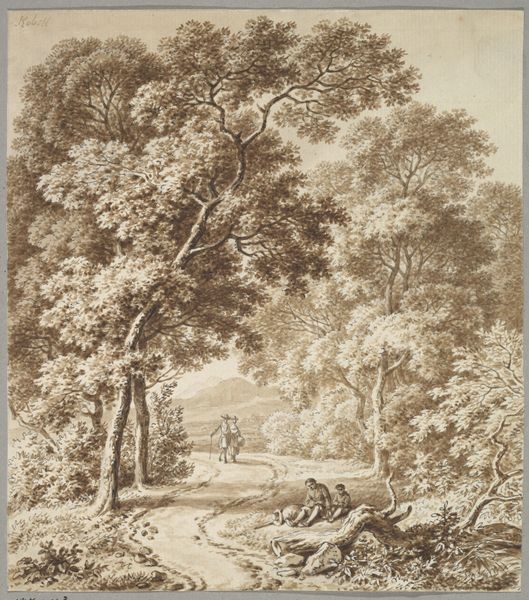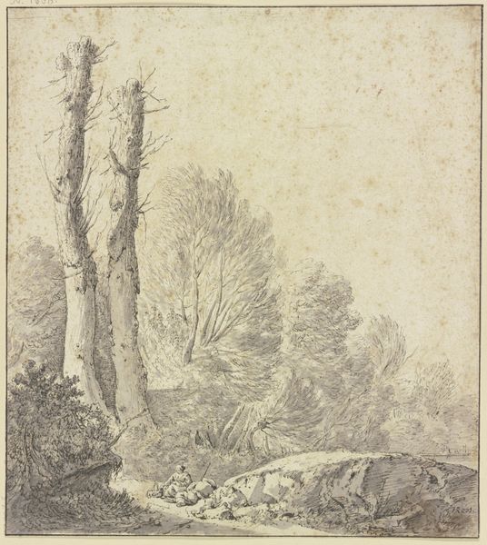 Curator: Jèrôme Preudhomme’s "Eine Figur unter einem Baum sitzend," or "A Figure Seated Beneath a Tree," created around 1800, is rendered in red chalk and pencil on drawing paper. It's a landscape housed right here at the Städel Museum. What’s your first impression? Editor: It's a quiet scene. The reddish monochrome creates an antique feel, and the leaning tree, dominates the composition, almost framing the figure at its base. There’s something melancholic about the piece; a sense of solitude permeates it. Curator: I agree. Remember that the 18th and early 19th centuries saw a surge in Romanticism. The solitary figure invites contemplation, which was a reaction against the Enlightenment's emphasis on reason. There's a search for solace in nature depicted here. Notice how the tree, with its dramatically bending trunk, contrasts with the more orderly landscape details behind it. Editor: Absolutely. That crooked, almost anthropomorphic tree really emphasizes the human scale and vulnerability. It’s fascinating how the artist used dry media to achieve such subtle variations in tone. Look at the delicate hatching! Curator: Technique definitely served to reinforce themes. Preudhomme captures not only the scene but also the experience of observing it. Landscape art served emergent bourgeois interests by presenting the natural world as safe for visual consumption but sublime in its potential for reverie. Editor: Yes, and I am intrigued by the figure partially obscured by the shadows. What does it mean? The way the human form blends in with the bark makes me think of how humanity’s problems intertwine with the natural order. The drawing invites us to reflect upon our place in the world. Curator: We are compelled to reconsider our relationship with our surroundings when looking at art from this period. Preudhomme reflects an increasing desire to protect it through a kind of stewardship. Editor: Thinking about the romanticist spirit in this work and the exquisite formal execution brings to mind an era where personal emotional depth started its slow swell into prominence. Curator: Precisely! And examining it with your lens offers another way into history itself.