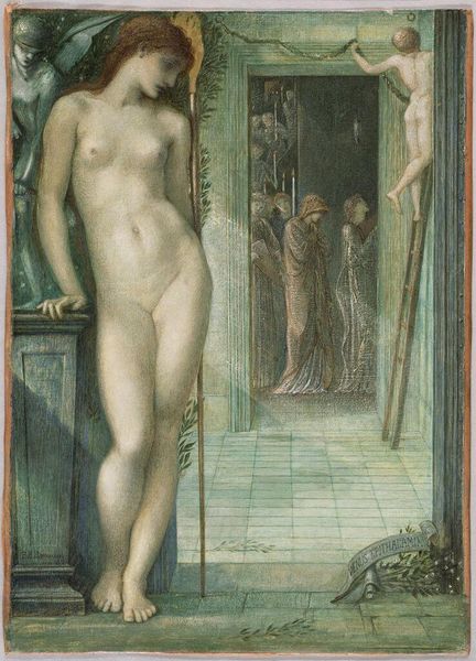 Curator: Edward Burne-Jones created this artwork titled, "Pygmalion And The Image – The Hand Refrains" in 1878. It is painted in oil. Editor: A rather somber encounter, wouldn’t you say? The color palette is muted, and there is a pervasive sense of hesitation. The sculptor and his creation both seem frozen, almost afraid to connect. Curator: Precisely. Consider the socio-economic conditions. Burne-Jones, aligning with the Pre-Raphaelite Brotherhood, consciously rejected the industrialization and mass production that dominated Victorian England. He turns back to a past of craft, a history when handmade objects carried inherent value, challenging the division between ‘art’ and ‘craft’ upheld by capitalist modes of production. Pygmalion’s painstaking creation, therefore, mirrors the artist’s own dedication to labor-intensive artistry. Editor: But even considering all the conditions of its making, there's more to it than that. It's beautifully rendered, particularly the interplay between the cool marble-like tones of the statue and the warmer flesh tones of Pygmalion himself. Notice the careful composition and use of light to further differentiate the two characters while linking them emotionally through shared glance. Curator: A deliberate juxtaposition, to be sure. But what truly captivates me is the representation of artistic labour. See, Burne-Jones does more than just retell a myth; he reinterprets it, putting an emphasis on artistic creation and the labor behind this piece and what the piece itself is doing to depict manual work and materiality. Editor: And the tension is palatable. I see how the formal structure itself emphasizes their distance, not just emotional but physical as well: between art and life, artist and object. His reluctance feels embedded into every deliberate compositional element. Curator: It begs us to look beyond the myth itself. Pygmalion’s labor, manifested in clay and stone, reminds us of art’s physical presence as commodity, and further it challenges the artist and consumer of art to reconcile creative integrity with the demands of an increasingly industrialized market. Editor: A rather comprehensive encounter, wouldn’t you say? So full of tension that is translated visually through all aspects. The painting's aesthetic properties themselves speak volumes about longing and irresolution. Curator: A productive reading that I feel is anchored in historical and social realities—it truly deepens our understanding and appreciation.