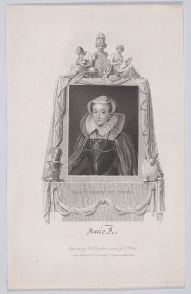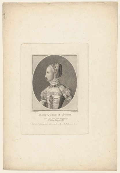 Curator: Here we have a print from 1793 by John Kay titled, “Mary, Queen of Scots.” Kay, known for his portrait drawings and engravings, created this piece using aquatint techniques. Editor: There’s something intensely mournful about her gaze. The tight oval framing seems to compress her, a kind of visual premonition of her eventual fate. Curator: Indeed, the political and social forces surrounding Mary’s life were far from liberating. It’s essential to recognize that this image, produced well after her execution, is laden with layers of historical interpretation and romanticism. Editor: Precisely. I'm intrigued by the medium—aquatint and engraving. There's an almost ghostly quality, a fine grain that enhances the sense of distance and perhaps reflects the layers of narrative that have built up around her. Consider the performance of sovereignty here – the costume, the adornments are presented, yet we look upon this figure of tragic and contested royalty. Curator: Right, and Kay, though Scottish himself, operated within a British artistic landscape deeply influenced by Neoclassicism, visible in the idealized portrayal and emphasis on line and form. What becomes of a legacy subjected to various styles across the centuries, reflecting the whims and agendas of powerful social institutions? Editor: What I appreciate is how art allows for continuous re-engagement. To really situate her image, shouldn't we explore Mary's image from perspectives often omitted like those from a feminist or postcolonial vantage point? The history is richer when approached through that lens. Curator: Agreed. It's crucial to constantly re-evaluate historical imagery, revealing underlying narratives of power and influence. Understanding the forces that shape visual culture is an ongoing project, right? Editor: Absolutely. I’m taking away a refreshed sense of both the inherent beauty and the intrinsic challenge that resides in understanding the narrative layers embedded in Kay’s work, encouraging me to investigate and understand history beyond one single representation.