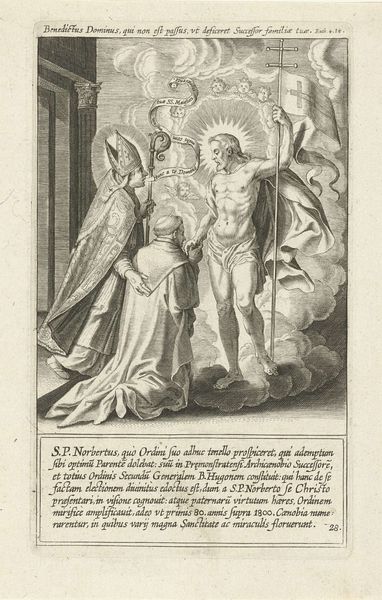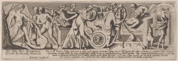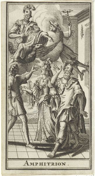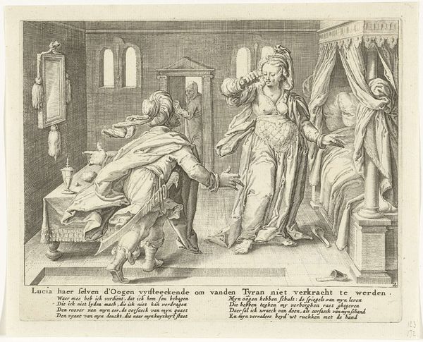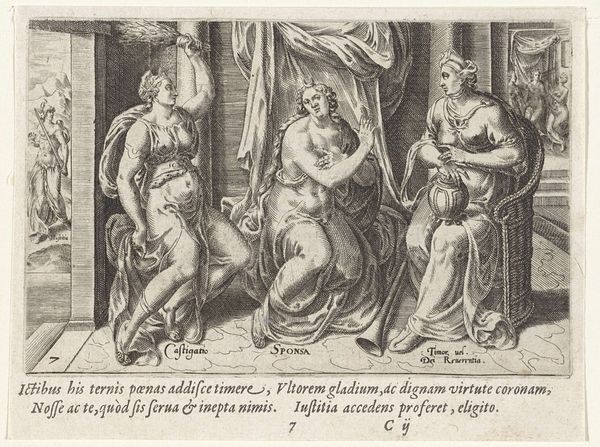 Curator: Here we have a work by Wierix, an engraving from 1574 entitled, "Godsvrucht bezoekt de bruid"—"The Fruit of God Visits the Bride." It’s currently held at the Rijksmuseum. Editor: Oh, how fascinating! The mood hits me immediately. It’s imbued with a rather stern and pious seriousness, don’t you think? Almost like a stage tableau… all these figures rendered with such fine lines! Curator: The stark contrasts certainly heighten the allegorical feel. This piece fits into a long tradition of visually representing complex theological concepts—marriage to God, virtue… They weren’t simply ideas but tangible presences to people then. Editor: Look, to me the messenger on the left seems much more imposing—maybe that's the ‘Godsvrucht’ you mentioned? It’s so wonderfully detailed, and I suppose there’s this whole business of earthly temptation at play here too, looking at her loose gown, with her foot appearing so vividly underneath it. Curator: Yes! The figure is "Fear of God"—and you're correct about her clothing. This print embodies the spiritual ideals of the era, particularly how earthly desires must take a subordinate position in life, in anticipation of salvation. Editor: Ah, there’s some clever theatrical staging—God’s Fear is blowing this massive horn to make us—and that introspective bride in her chair—notice something. But why is the horn engraved with what appears to be "VE VE VE"? It looks so unusual on what’s apparently an illustration of biblical text. Curator: The word inscribed on the horn is an abbreviation of "Venite," Latin for "come," implying an invitation to contemplate death and, crucially, repent one's sins. Editor: Repent, come. Such dark, weighty reminders seem heavy indeed for what’s essentially supposed to be a bridal celebration. That kneeling couple in the shadows to the right appear afraid! Curator: Perhaps, but remember that during this time the spiritual health of one’s soul far outweighed temporal earthly joys. The artist conveys moral rectitude, juxtaposing transience with permanence through potent symbolism. Editor: In any case, what stands out is the intense precision. I wonder how many attempts it took the artist to get that level of detail? It gives it a peculiar weight, a sense of something lasting that feels very...final. Curator: Yes, and it invites a continued contemplation. One can see, feel, experience how images truly serve as vessels of collective cultural meaning over time.