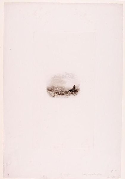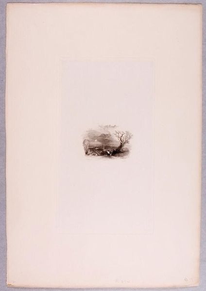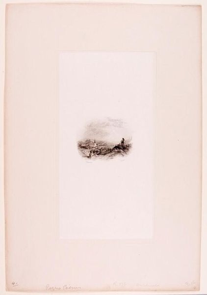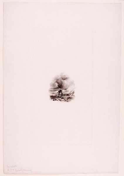 Curator: This is Edward Goodall's print, "Columbus Setting Sail," housed here at the Harvard Art Museums. The composition really emphasizes a central grouping amidst a vast expanse of negative space. Editor: It feels wistful, doesn't it? Like a fading memory more than a heroic embarkation. The scale is so intimate, it's as if the artist is holding this whole world in the palm of their hand. Curator: The etching technique certainly contributes to that feeling. Note how the fine lines create a sense of detail while also maintaining an overall lightness. It's a fascinating interplay of precision and suggestion. Editor: Absolutely. And that emptiness surrounding the central scene – it mirrors the unknown into which Columbus was sailing, all that potential, all that uncertainty. Makes you wonder what Goodall wanted to say. Curator: A fine point. Perhaps by reducing the scene to its barest essentials, he’s directing our attention to the inherent drama of the narrative itself. Editor: I'm left pondering the thin line between hope and trepidation, and what a precarious journey it really was. Curator: Indeed. It's an evocative piece that rewards close consideration.