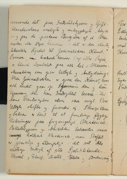 Curator: This piece, titled "Alf Petersens gloser og bemærkninger til Atta Troll," made between 1930 and 1938 by Niels Larsen Stevns, seems to be a collection of notes related to the poem "Atta Troll." It’s composed of drawing, textile, paper, and ink, demonstrating what looks like calligraphy. My first impression is that this notebook page shows the tangible work and intellectual labor involved in understanding and annotating literature. What strikes you about this object? Editor: The materiality. The use of ink on what looks like aged paper creates a strong sense of intimacy, almost like peering into someone's personal study. What does the context of these materials – the paper, the ink – tell us about the artist's process? Curator: That’s an insightful point. The use of relatively inexpensive and readily available materials suggests a focus on the process of knowledge production and dissemination rather than preciousness of the art object itself. Stevns’ choices here demonstrate the availability and cost of resources – this would’ve been more about the functionality, not the aesthetics, or even the legacy. Editor: So, the artist’s economic and social context influenced their choices of medium. Was Stevns then challenging the idea of the "high art" object by prioritizing accessibility and intellectual pursuit? Curator: Exactly. This piece emphasizes the labor of reading, interpreting, and creating meaning. Instead of a finished "artwork", it presents a record of intellectual work, much like craft, where labor is readily visible. The use of textile further suggests an everyday utility, binding these thoughts together for ease of access, possibly in an act of consuming then re-using materials, not unlike how Petersen must’ve consumed “Atta Troll.” Editor: Fascinating. So, it’s not just about the finished product, but about understanding art within the means of its creation, and in terms of Stevns' interaction with the work "Atta Troll.” Thanks! Curator: Precisely. By looking closely at the material conditions and considering the context, we gain insight into the values and the social processes embedded in the work itself.