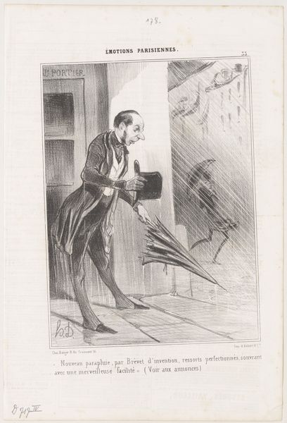 Honoré Daumier created this lithograph, "New patented umbrella," using limestone and greasy crayons. These aren't exactly common art materials, but Daumier was no stranger to using the processes of mass production to share his art and ideas. The image’s appearance results from the push and pull between stone, crayon, and the artist’s hand. The velvety blacks and subtle grays all come from the way the grease adheres to the porous surface. Daumier was a master of this medium. His skill allowed him to imbue the image with social commentary, reflecting on Parisian life and the emerging culture of consumerism. Here, we see the promise of innovation – the "improved spring system" – juxtaposed with the reality of a rainy day and the relentless pursuit of progress. It is a reminder that the things we produce reflect not only our ingenuity but also our social and economic realities. Hopefully, this encourages you to see the connection between materials, making, and the wider world.
