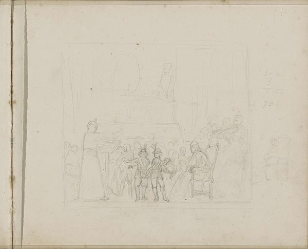 Editor: This drawing, "Illustration zu Schiller's Glocke," is by Philipp Winterwerb. The artwork, currently at the Städel Museum, is a pencil and chalk drawing related to Schiller's poem 'The Song of the Bell'. I notice the sketched figures; some seem downtrodden, others celebratory. It strikes me as an image with stark emotional contrasts. What's your interpretation? Curator: It's interesting how you picked up on the emotional contrasts. Looking at this through an activist lens, it brings up questions about whose stories are being told and how. "The Song of the Bell" is about community and progress, but who benefits from that progress? Notice how certain figures are burdened, suggesting uneven distribution of labor and reward. Editor: So you’re seeing it as a critique of societal hierarchies within this idealized Romantic vision? Curator: Precisely! Consider the time period, the 19th century. Romanticism often idealizes the past and nature, but this drawing hints at underlying social tensions, class divisions perhaps? Are these celebrations masking exploitation? Who is forging the bell, and for whose ears does it toll? Editor: I see what you mean. I hadn't considered the power dynamics implicit in illustrating this poem. Curator: Exactly. We have to question the narrative, understand who is empowered and disempowered within the depicted society, and by extension, in our own. Who controls the means of production, then and now? Editor: It makes me think about how art, even when seemingly focused on beauty or tradition, can reflect or challenge existing power structures. Curator: Absolutely! It invites us to think critically about the societal implications that are woven into art from any period. It’s about using art history to interrogate contemporary realities. Editor: I hadn't approached this artwork in that way before. Now I'm looking at it with a new perspective on the relationship between art and society.