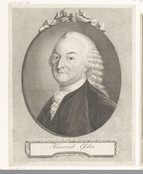 Georg Friedrich Schmidt created this engraving, "Portret van Christian Friedrich Blume," situating us within the visual culture of 18th-century portraiture. The image presents Blume, a figure of presumably notable status, framed within an oval border, his name elegantly inscribed below. Consider the conventions of portraiture during this era. Typically, portraits served to solidify the subject's identity within a specific societal framework, often reinforcing class and gender norms. Blume’s attire and wig speak to a certain social standing. What interests me, though, is how Schmidt uses the printmaking medium itself. There's a performative aspect to portraiture – the sitter posing, the artist capturing. Here, the engraving allows for the reproduction and dissemination of Blume’s image, extending his presence and influence beyond the immediate confines of a painted canvas. The emotional resonance lies in the subtle negotiation between the subject's self-presentation and the artist's interpretation, a dance of identity played out on the copper plate.
