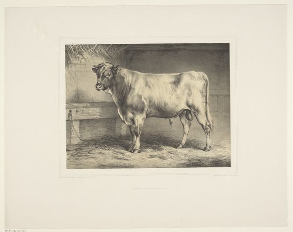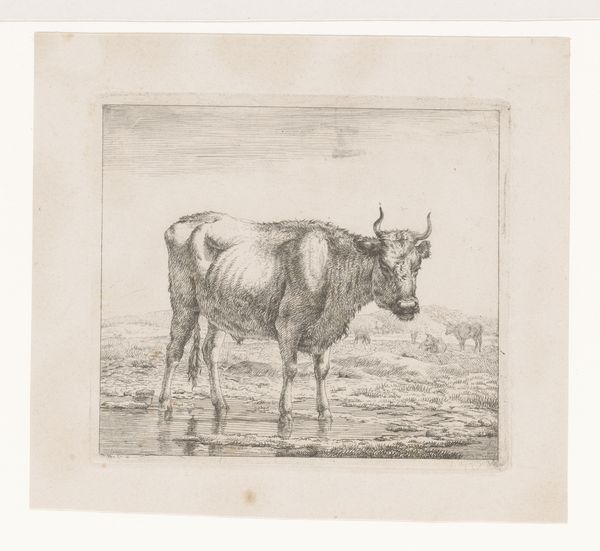 Editor: Right this way to Auguste Danse’s "Stier in de wei," created in 1897. It's an etching, and what strikes me is how this mundane scene feels so monumental and almost mythic, how does it strike you? Curator: It is striking. Looking at it through a historical lens, the late 19th century saw a rising interest in rural life, idealized through art, while industrialization was rapidly changing society. How do you think this etching fits into that socio-political context? Editor: That’s fascinating. I suppose it offers a romanticized, perhaps even nostalgic, image of rural existence. I wonder, did this representation reinforce or challenge the dominant narratives of the time? Curator: Good question. The realism of the etching, combined with its artistic rendering, treads a fine line. While it presents a 'real' bull in a field, the composition and light also imbue it with a sense of nobility. This could both reinforce the value of agricultural life, portraying it with dignity, and perhaps subtly critique the social displacement caused by industrial growth. Consider where the work would have been shown: likely in galleries and exhibitions frequented by the urban elite, and consider its influence. Editor: So the image may speak differently depending on who is looking at it and where they encounter it. What considerations would have shaped that kind of visual presentation in the Rijksmuseum where it now resides? Curator: Indeed. Think about the function of museums like the Rijksmuseum. How do they shape and frame national identity? "Stier in de wei" can contribute to a narrative of Dutch national identity rooted in its landscape and agricultural heritage. Editor: That makes me see it in a completely new light. I originally just thought it was a picture of a cow! Curator: Well, and that too. That is what’s exciting; unpacking how art reflects and shapes cultural values makes even a humble etching incredibly resonant.