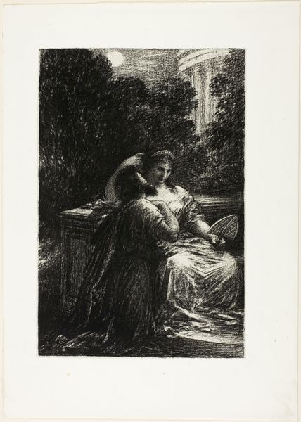 Henri Fantin-Latour created this lithograph depicting a love scene from Act III of Richard Wagner's opera "Lohengrin" sometime in the 19th century. Fantin-Latour was part of a vibrant Parisian art scene, where Wagner's music was both celebrated and controversial. The image captures a tender moment between the characters Elsa and Lohengrin. Fantin-Latour, deeply inspired by Wagner’s vision of dramatic intensity, creates a dreamy, romantic atmosphere. But let’s consider the narratives at play here. In Wagner’s opera, Elsa’s identity is rooted in her purity and innocence, while Lohengrin remains an enigmatic figure. This scene, full of love and promise, exists only moments before doubt and societal pressure lead to tragedy. Fantin-Latour’s print, with its delicate lines and intimate portrayal, invites us to reflect on the complex interplay between love, identity, and the often tragic constraints imposed by society. It’s a powerful reminder of how personal emotions are always interwoven with broader cultural narratives.